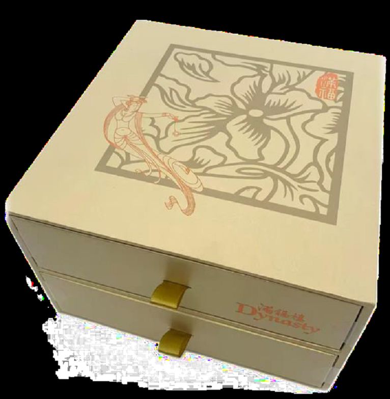 This beige gift box features elegant patterns of dragons and flowers. Its drawer design is complemented by golden handles, seemingly containing an abundance of ancient charm and refinement, fully embodying the elegance of the East.