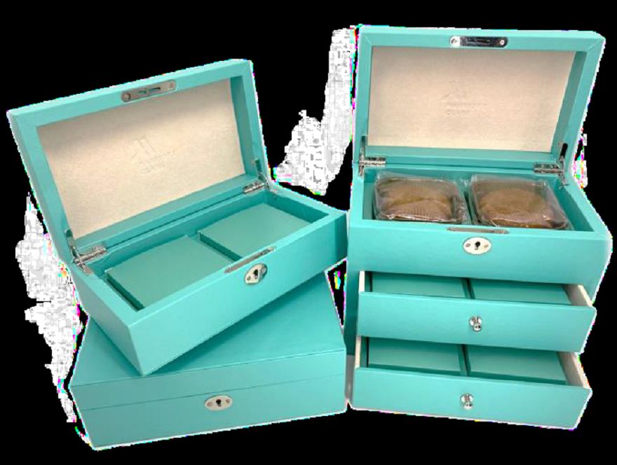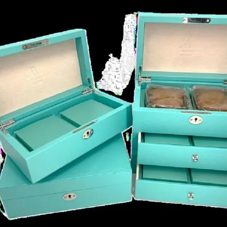 This set of ice-blue gift boxes is as exquisite as a jewelry box. The lock and the layered design showcase meticulous craftsmanship, seemingly concealing a wealth of surprises and textures within the box, presenting a light, luxurious and elegant appearance.