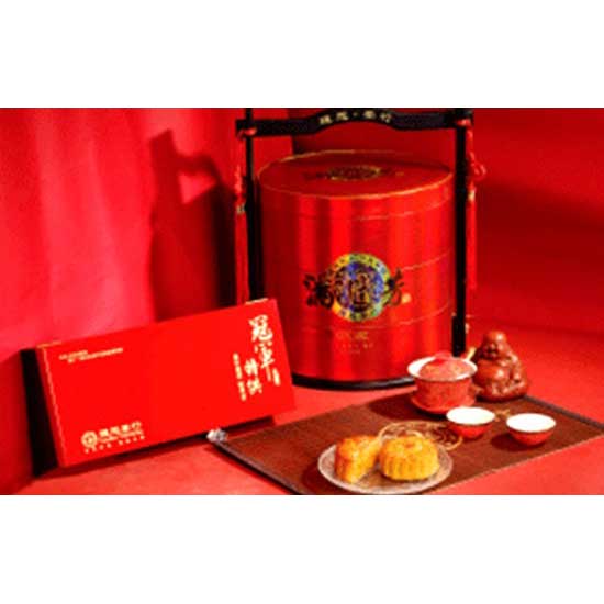 Displayed is an excellent moon cake gift set that is designed for the Mid-Autumn Festival. This top-quality moon cake gift set boasts an innovative touch by utilizing non-traditional pastes. This fine set is skillfully made to ensure your satisfaction.