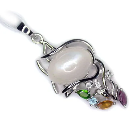 This gorgeous pendant features an oval-shaped white moon stone accented by colorful tiny semi-precious stones. The jewelry is crafted from glimmering silver in a polished finish. It makes an ideal accessory for any special occasion.