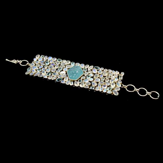 Showcased here is a splendid magic carpet bracelet made with moonstone and aquamarine. Multi-color jewels of various shapes are used for an extravagant look. This immensely bold, stylish bracelet is ideal for a lot of occasions.
