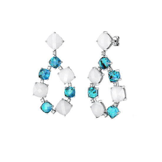 This pair of drape earrings comes with cushion-cut moonstones in snow-white and blue London topaz stones. The earrings are decorated with dazzling diamonds for excellent radiance. The 18k white gold construction enhances its elegance and luxuriousness.
