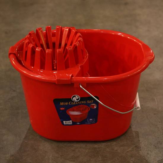 This is a mop cleaning set which includes a bucket with a spueezer. There are wheels at the bottom for moving it around the room conveniently.