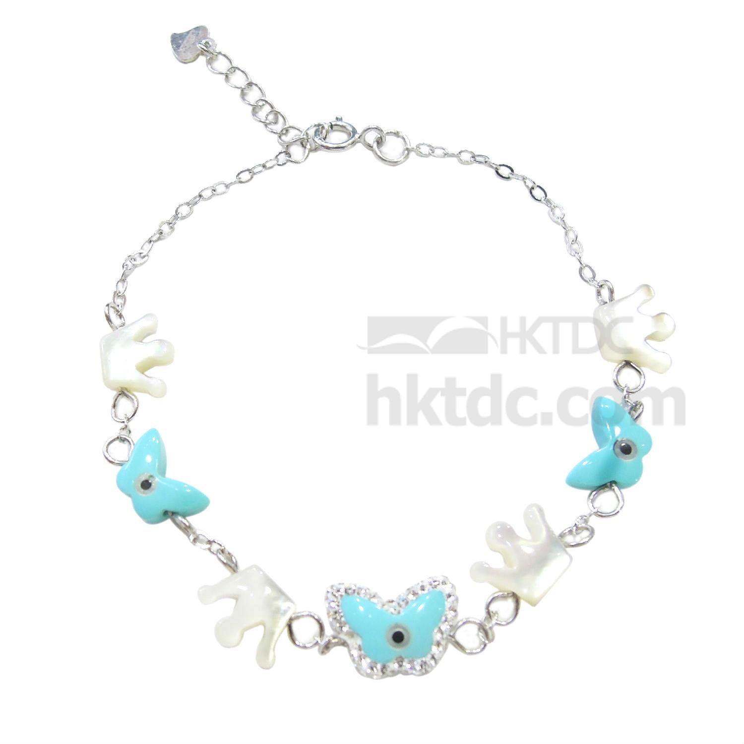 This is a bracelet that is made of 925 silver and mother of pearl charm. It features butterfly-shaped charms with blue evil eye. This bracelet is easy to mix and match with any trendy outfit.