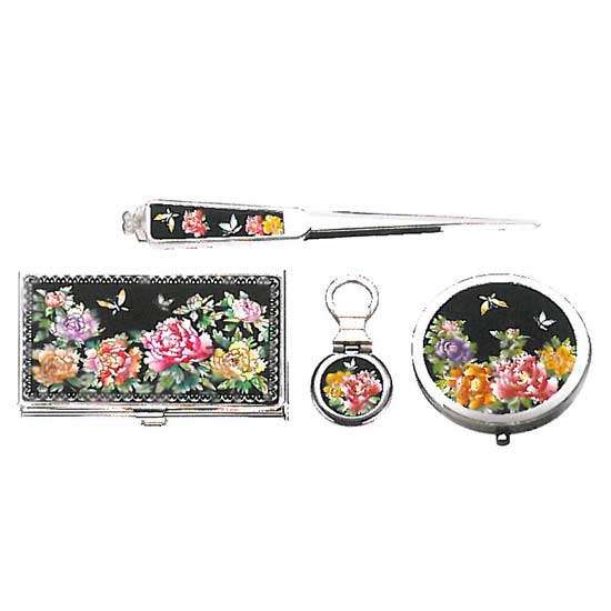 The gift set includes a letter opener, a keychain, a name card holder and a cosmetic mirror. Each item features a unique picture portraying beautiful flowers in vivid colors. This gift set makes a great companion for sophisticated women.