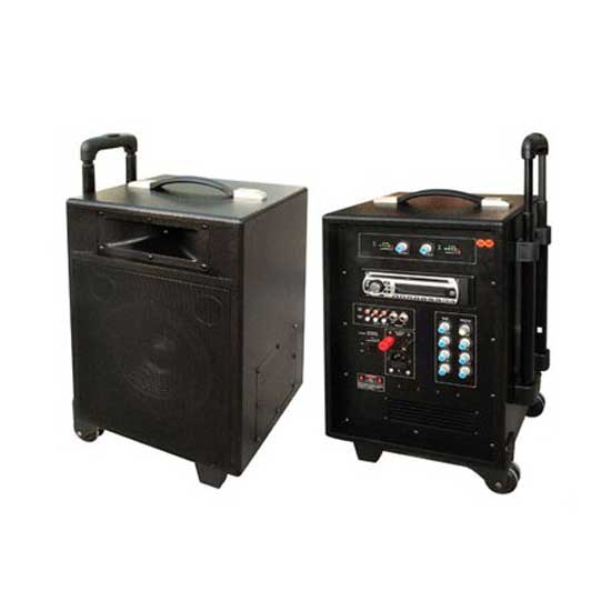 Displayed is a movable amplifier system with a built-in audio clip to control signal circuit. The dual-frequency system is engineered for heavy-duty operation with high stability. This movable amplifier system is suitable to use on performance stages.