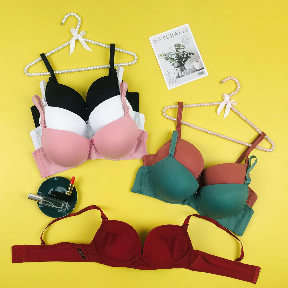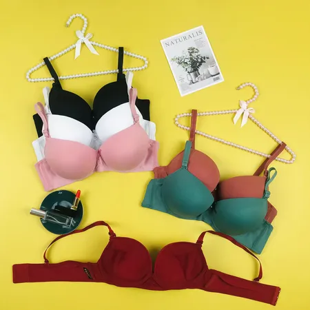 This collection showcases multi-color push-up bras that merge style and comfort seamlessly. Available in various solid colors like black, white, pink, a green-red combination, and red, these bras feature a push-up design to enhance your shape while ensuring a comfortable fit. The diverse styles cater to different preferences and outfits, making them a versatile addition to your lingerie wardrobe. Accompanied by chic pearl hangers, a fashion magazine, and beauty accessories like perfume and lipstick in the display, these bras are not only functional but also reflect a trendy lifestyle. Whether for daily wear or special occasions, this bra collection offers both support and a fashionable look, allowing you to express your personal style with ease.
