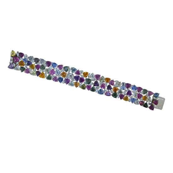 This colorful and elegant bracelet is made up of multi-color sapphires and fancy-cut diamonds. Sapphires of blue, orange, pink, green, purple and white are used, offering a delightful style. The bracelet makes a stylish accessory to line your wrist daily.