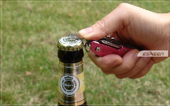 Displayed here is a pocket knife with 9 functions. It includes everything needed for opening bottles, driving screws, etc. This 9-function pocket knife is a great accessory on your journey.