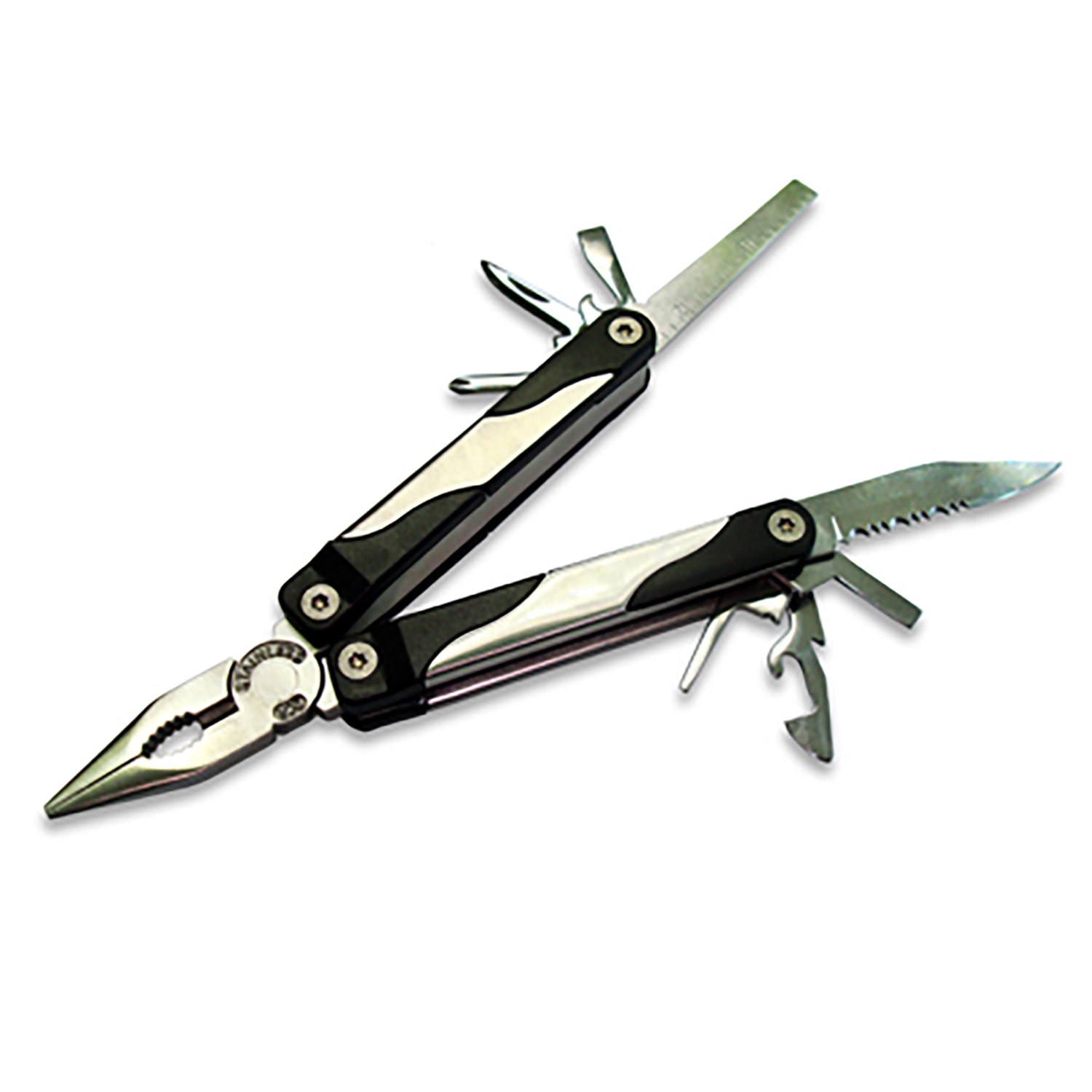 Multi functional tool with spring-loaded needle-nose pliers and spring-loaded regular pliers packaged in black nylon pouch includes the following features: