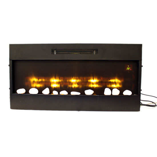 Displayed is a multifunctional fireplace with bright LED lights for a touch of uniqueness. This fireplace is made of glass and MDF material for added durability. With a digital display, this fireplace will fill your room with comfy heat and an extra ambiance.