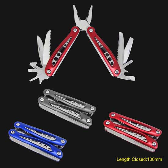 • Function components include: needle nose pliers, wire cutters and strippers, serrated knife blade, normal knife blade, can opener, large/medium/small flat screwdriver, bottle opener, Phillips screwdriver, file, and saw.