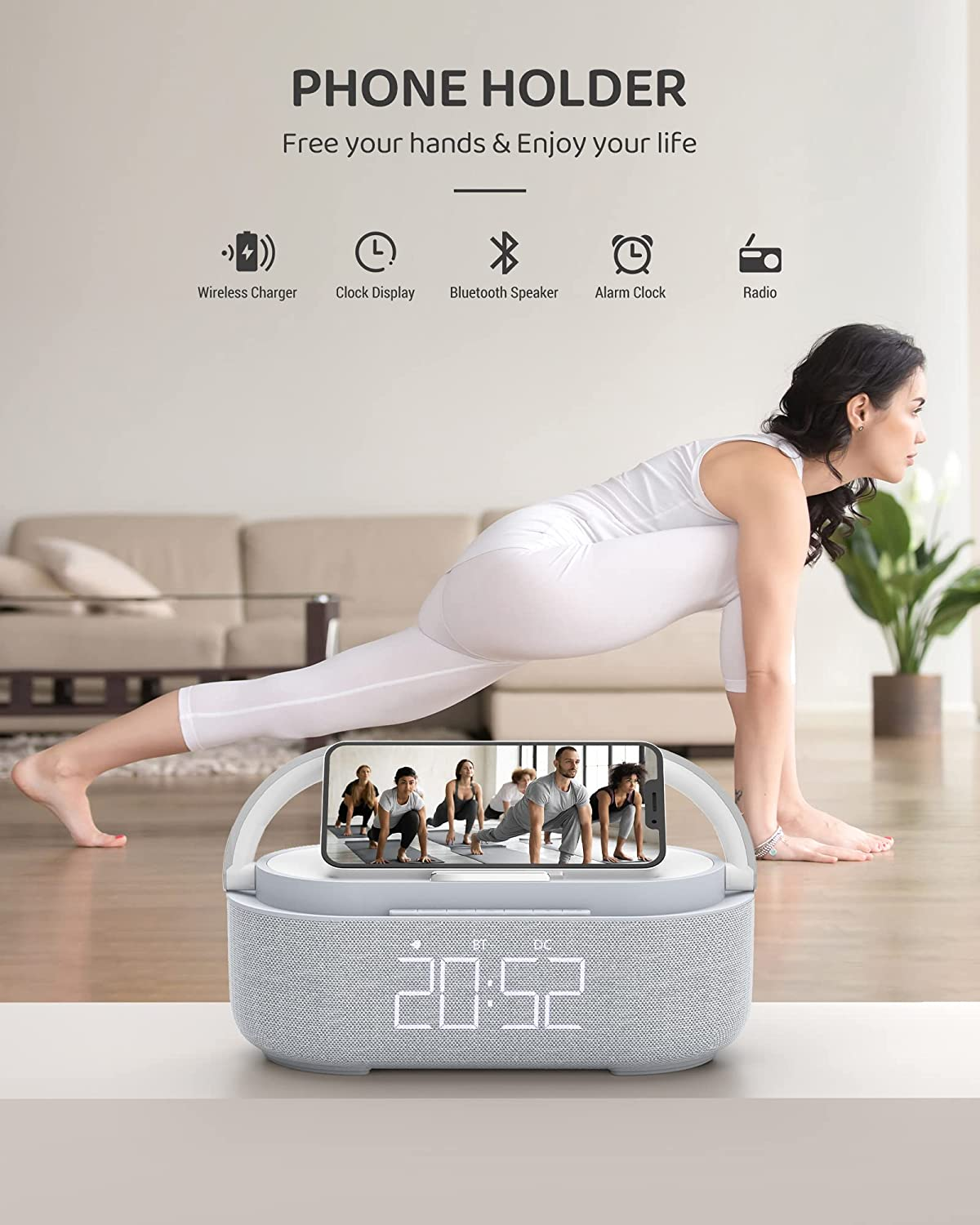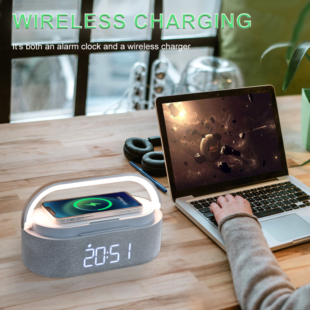 FEATURES:Radio;Night light;Wireless charger;Bluetooth speaker;Digital alarm clock,phone stand