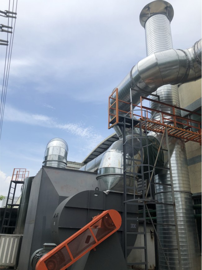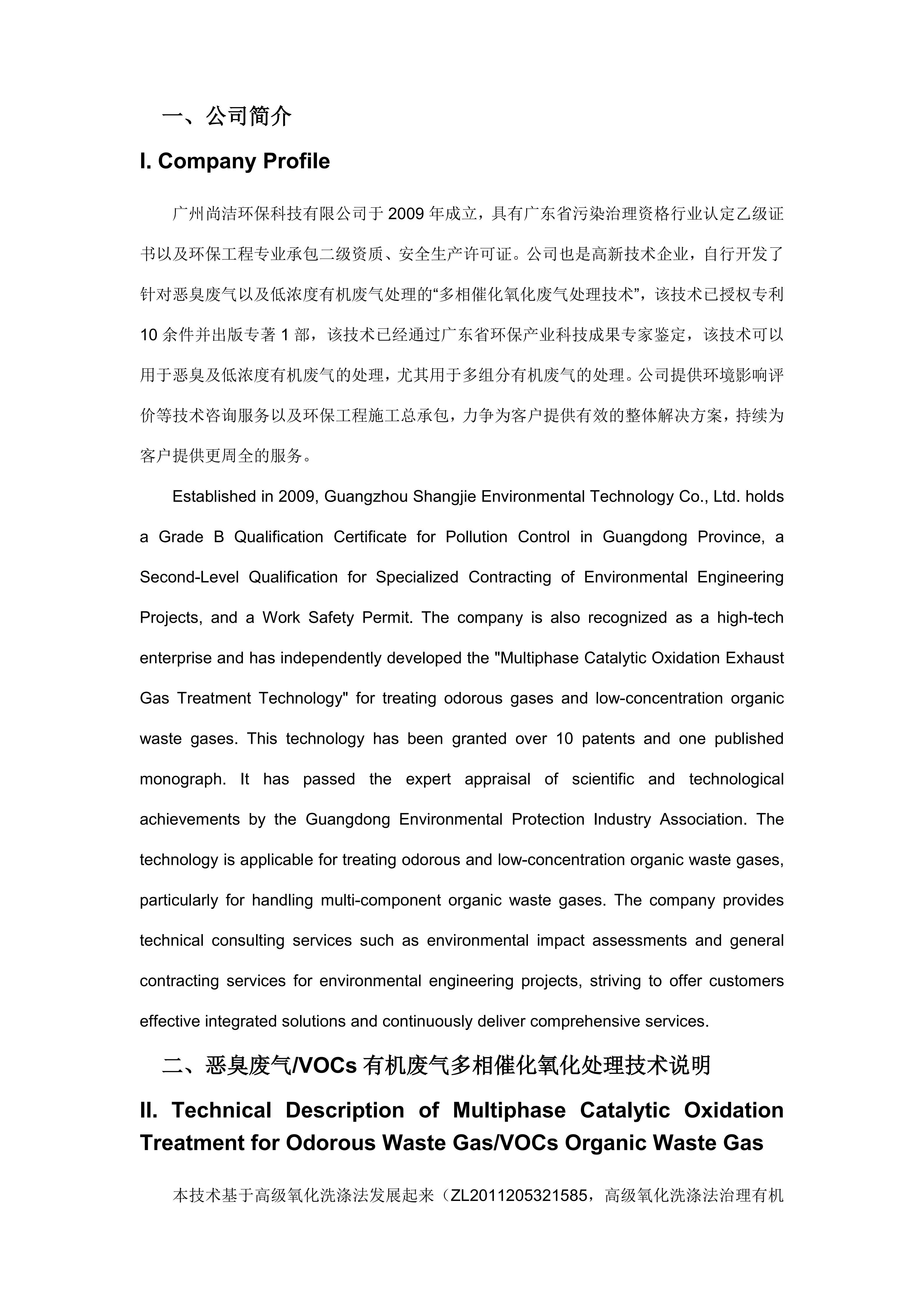 This technology, developed based on advanced oxidation scrubbing (ZL2011205321585, Integrated Device for Treating Organic Waste Gas by Advanced Oxidation Scrubbing, authorized on August 15, 2012), incorporates carbon-based catalysts and active oxygen molecule technology, overcoming the limitations of advanced oxidation scrubbing and forming a novel multiphase catalytic oxidation treatment technology for odorous/VOCs waste gas.