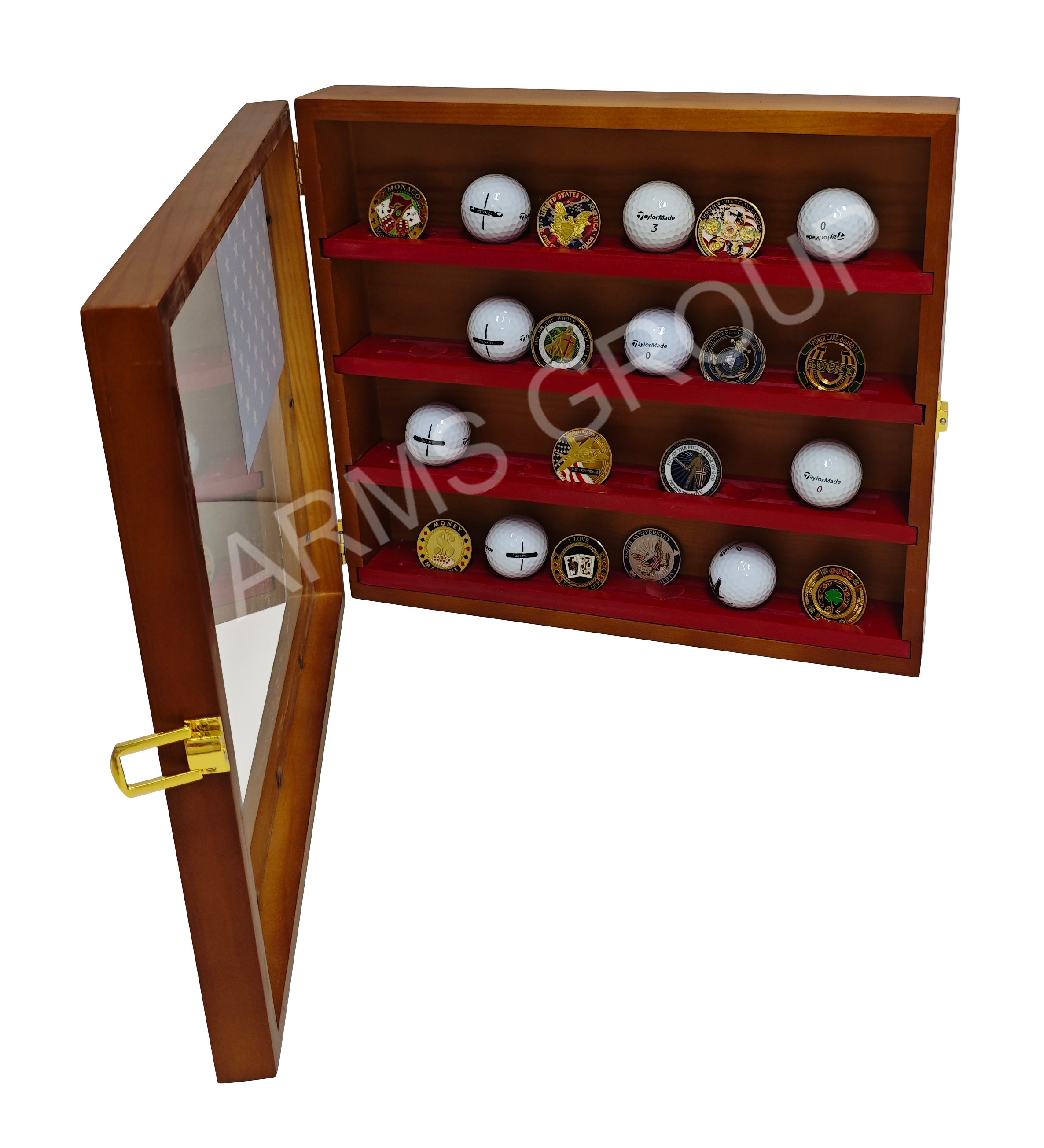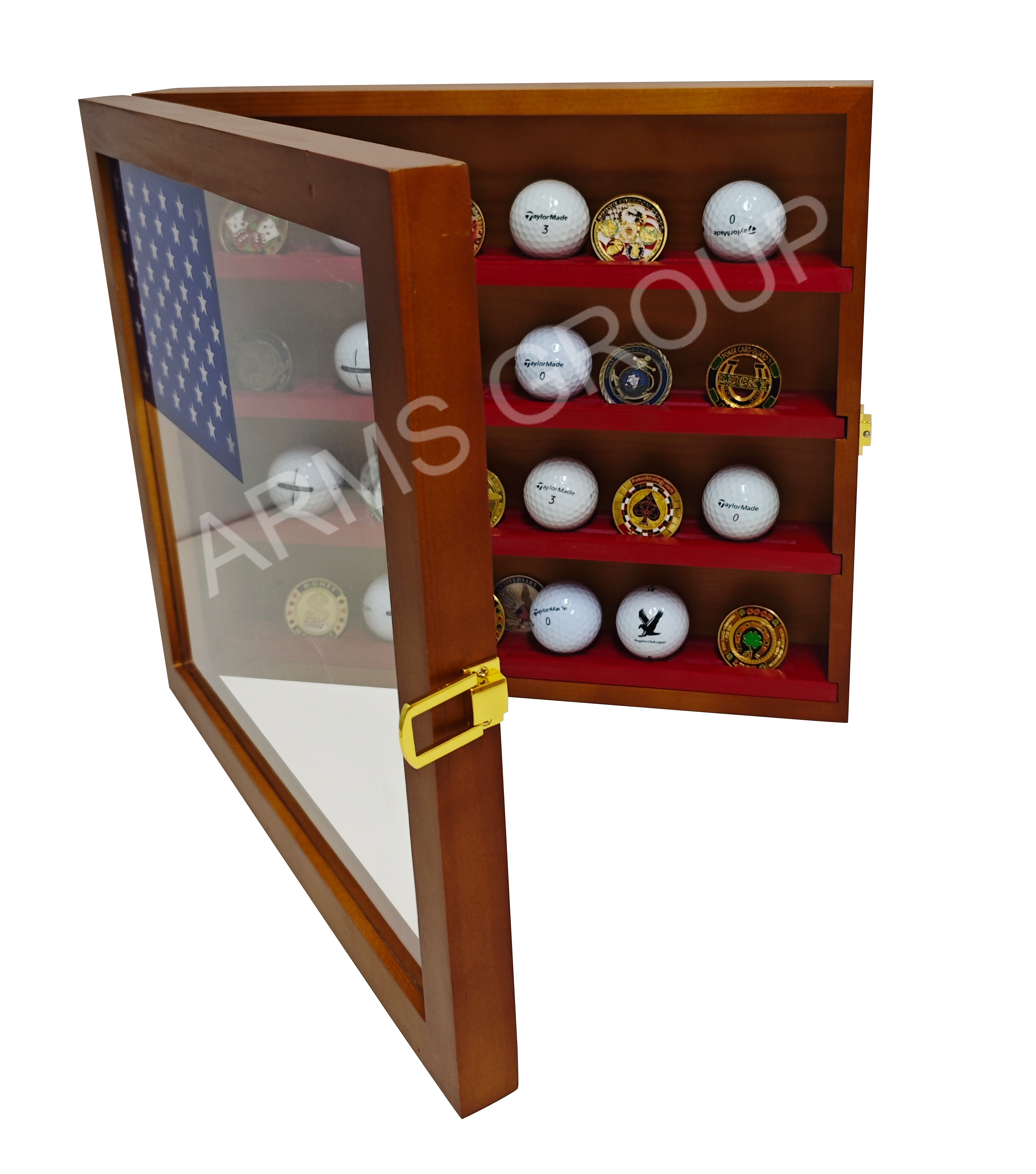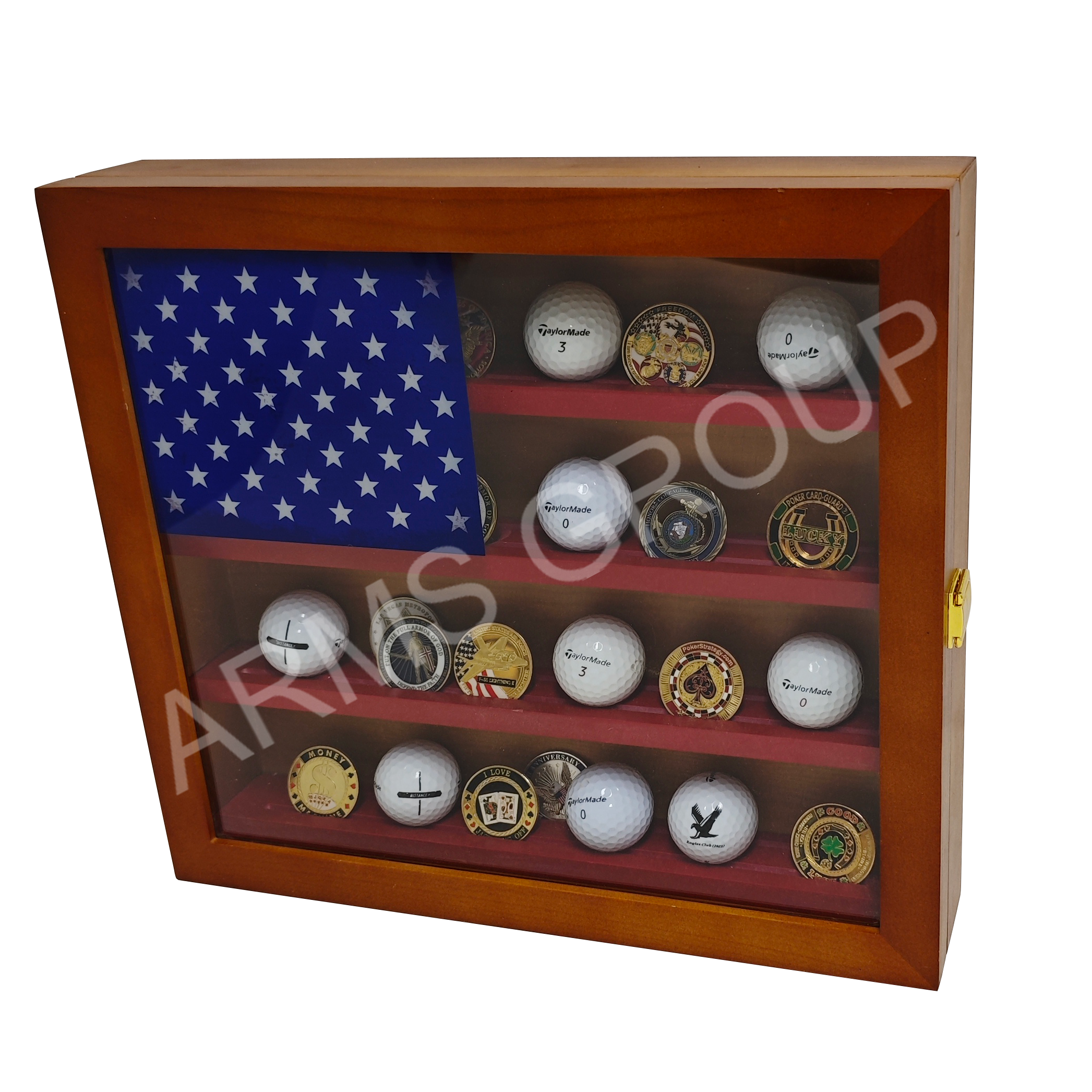 Crafted from solid brown wood with a rustic Americana design, this multiple-tier desktop display rack is perfect for showcasing golf balls, challenge coins, or other collectibles. The glass front and brass latch provide both protection and elegance, while the patriotic flag-inspired background adds a distinctive decorative touch. Ideal for home décor, sports memorabilia collections, or as a unique gift item. Customization with logo or engraving is available.