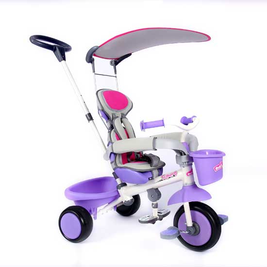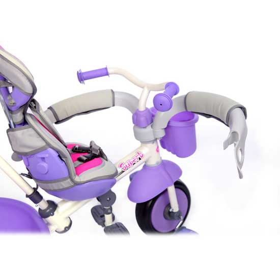 This displayed multipurpose tricycle is designed for kids from 6 to 36 months old. It comes with a large and comfortable seat space, including a soft seat pad and a 5-point seat belt. The removable baby bar can be opened side to side, allowing a kid to go in and out easily. The adjustable canopy can be stored at the back of the seat.