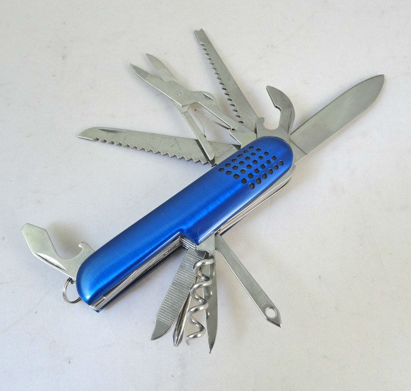The pocket multifunctional pliers features spring-loaded long nose pliers as well as regular pliers, a wire cutter, a serrated blade and a knife for survival gear enthusiasts, a handy bottle opener, a cross-head screwdriver, a large and a small slotted screwdriver, a nail file, a can opener and even a wood saw blade.