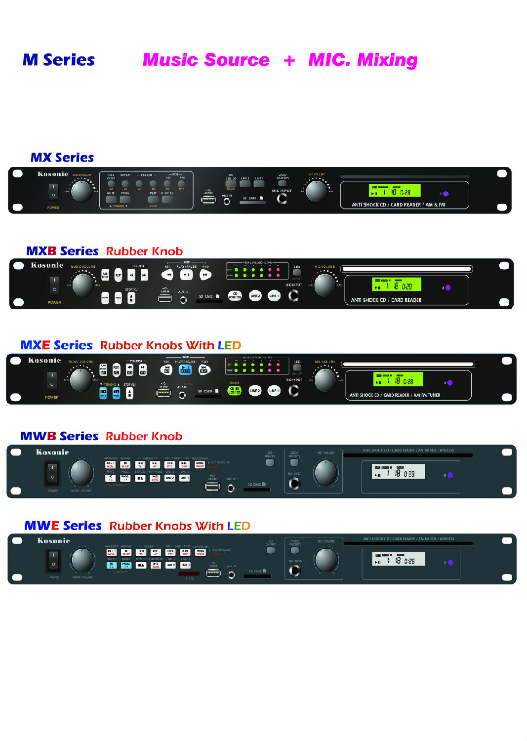 M Series is in standard 1U mount rack featuring MIC Mixing, CD Player, USB & SD Card Reader and AM FM RDS Tuner function. The CD mechanism is from Japanese Co. – TANASHIN. The quality is good for professional long time use. The excellent Anti Shock system protect the player from vibration