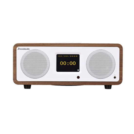 This music system is designed with a Wi-Fi radio station. It features a rectangular housing with wooden patterns in brown. The pure white front panel adds a touch of elegance to this design.