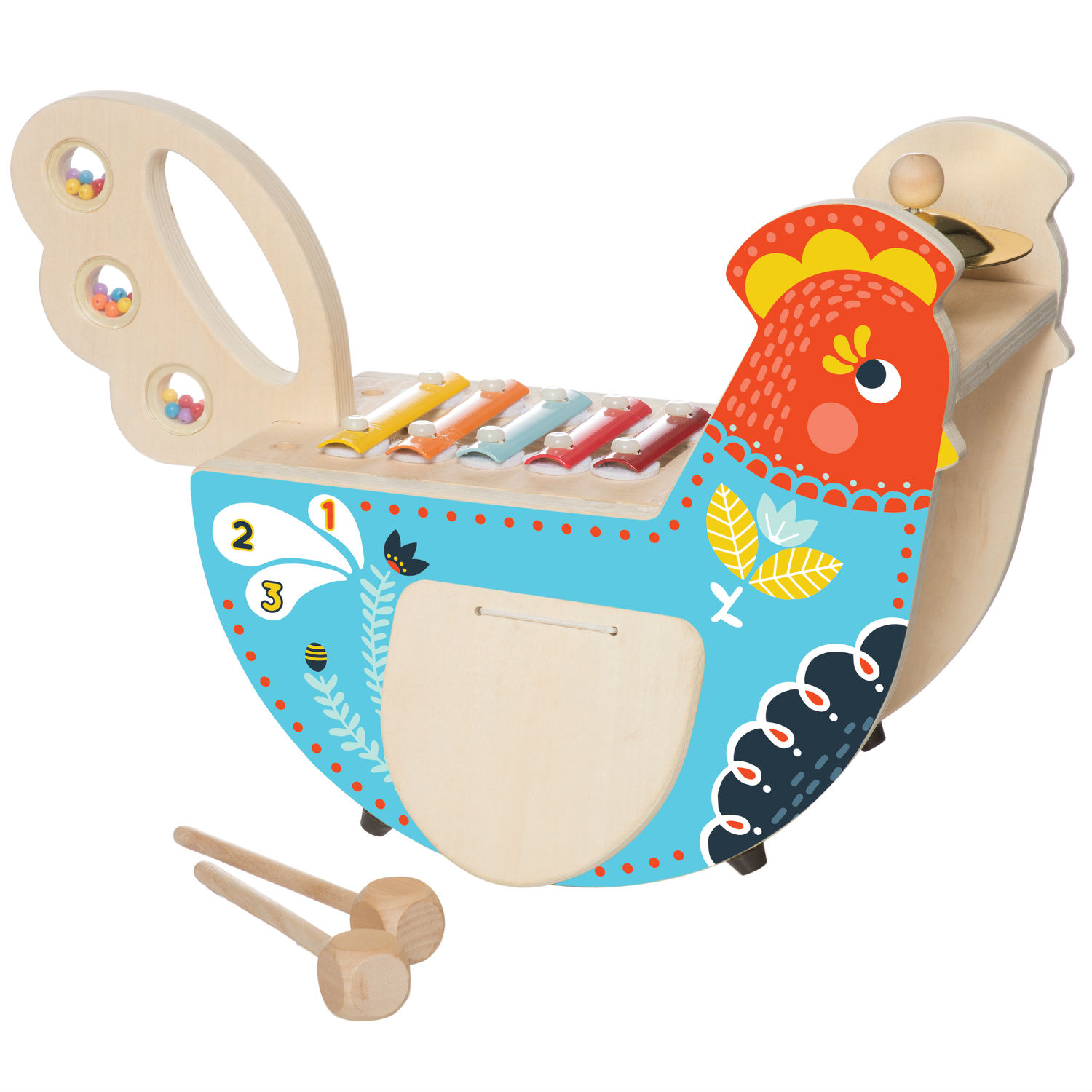 Musical instruments include: 1 cymbal, 5-bar xylophone, 1 maraca tail, 2 drums on the sides with detachable drum sticks on back. The tail feathers of this unique chicken can be removed and double as a maraca.