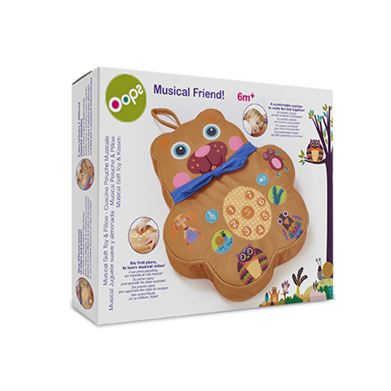 Musical Friend! is the cheerful musical Oops cushion for learning the music and sounds of nature in the company of beautiful Oops friends. Young composers will enjoy themselves inventing many different melodies with their first piano or listening to the cheerful songs which are already available. And then there are the sounds of nature and the many animal sounds. The soft padding turns the game into a comfortable cushion, and its cover is easily removed for washing.