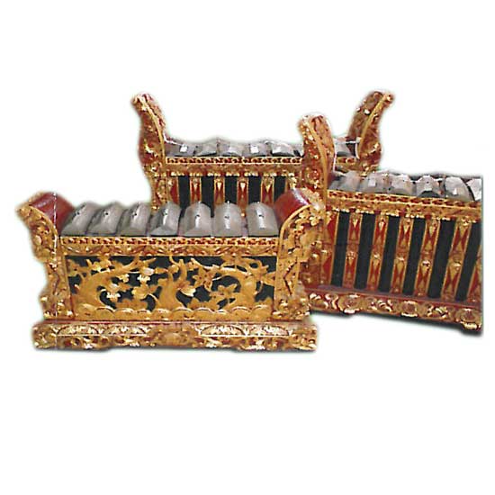 Showcased here is a pelegongan, a traditional musical instrument in Southeast Asia. It gives out wonderful music with an exotic style. The pelegonan is crafted with meticulous attention to details for a sense of elegance.