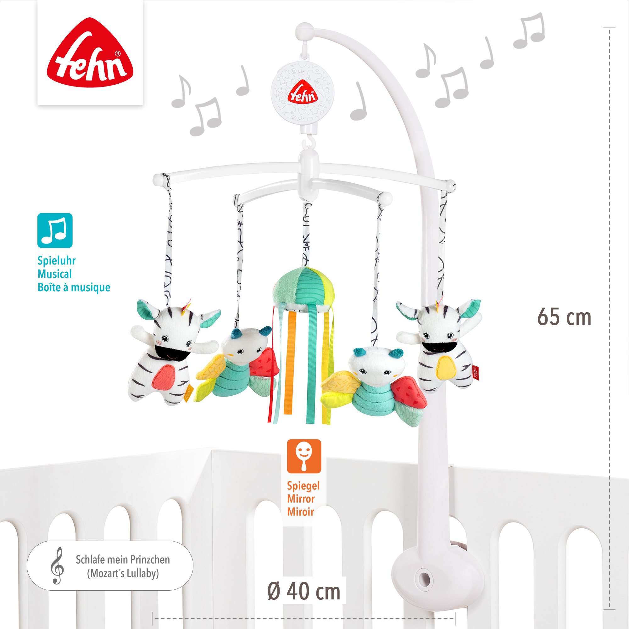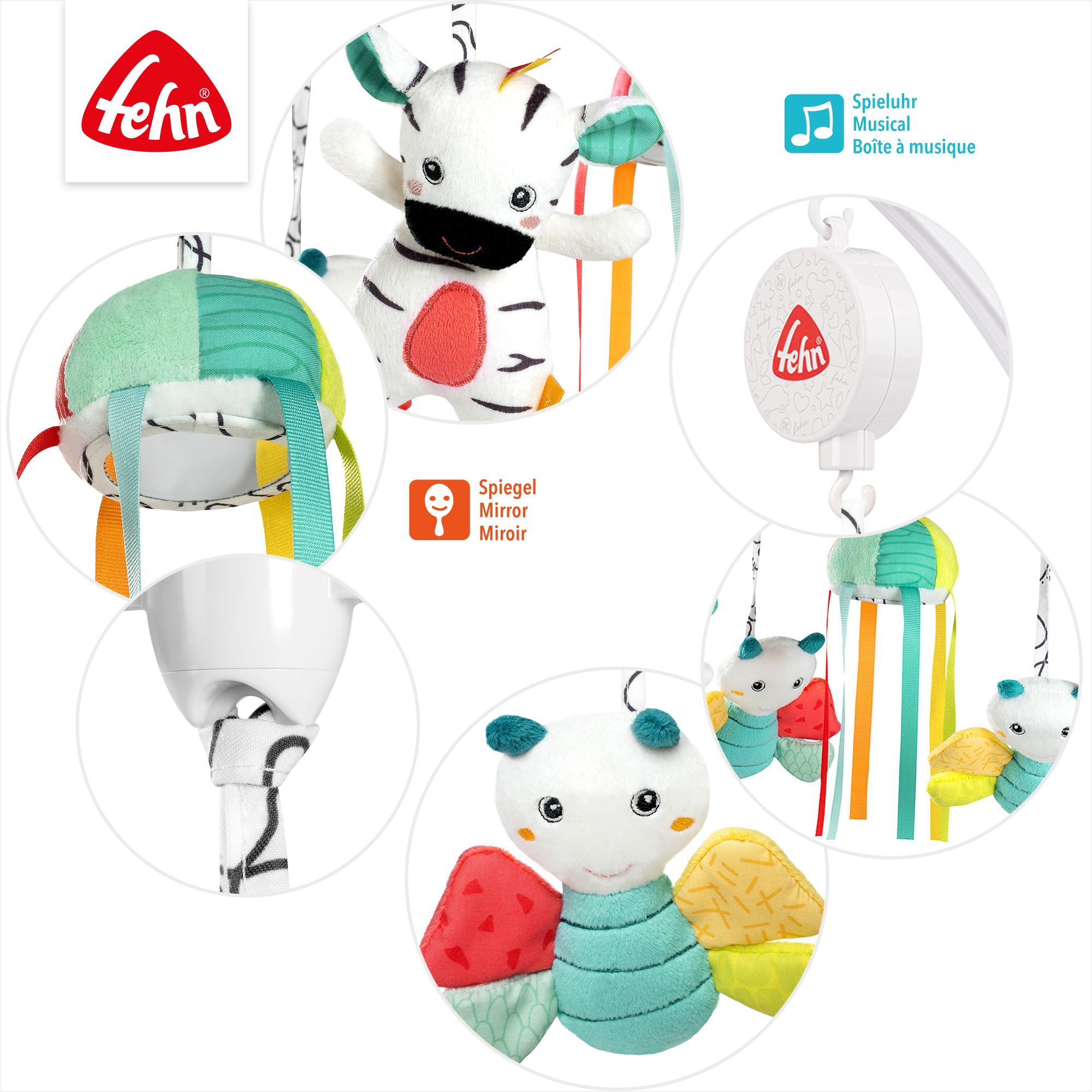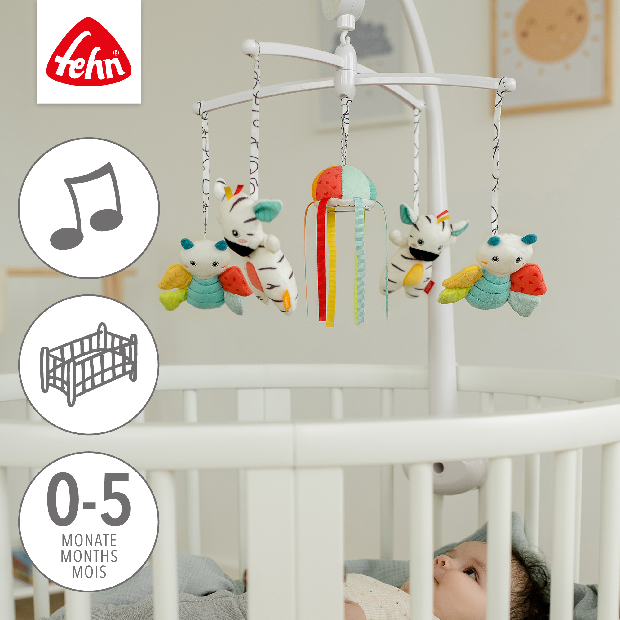 The colourful musical mobile from the DoBabyDoo collection is an ideal sleep aid. The little butterflies and zebras turn in circles to the beautiful melody "Mozart's Lullaby" and encourage the baby to look and listen. In quiet minutes, the mechanical play mechanism can be easily turned off thanks to the on/off switch. During the day, the small stuffed figures on the music mobile keep the baby entertained: they capture the baby's attention and awaken the imagination. The mobile is easily attached to the baby's cot and will soon be indispensable! --- Bed mobile with mechanical musical mechanism with on/off switch / melody: Mozart's lullaby / playing time approx. 3-4 minutes / for babies from 0-5 months / Top material: velvet, printed fabric / Filling: polyester / ideal as a gift for birth or baptism for babies and toddlers / tested for safety by independent testing institutes