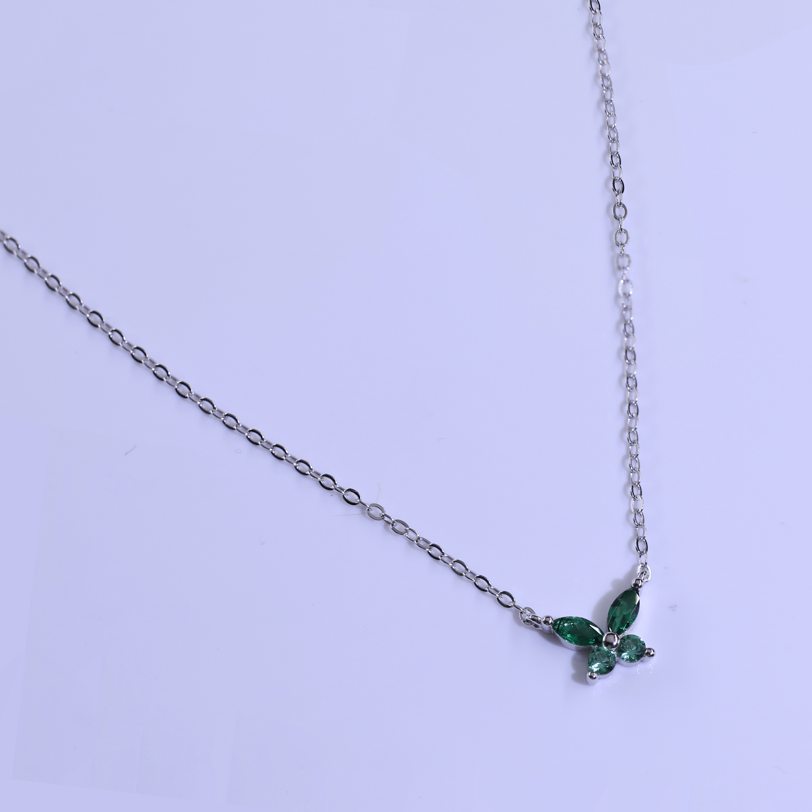 The pendant showcases a stylized butterfly design, with wings crafted from vibrant green, marquise-cut stones that are carefully set in a polished silver-colored framework. A small, clear stone forms the butterfly’s body, adding a touch of sparkle. This necklace combines elegance with a playful charm, making it a perfect accessory for any occasion.