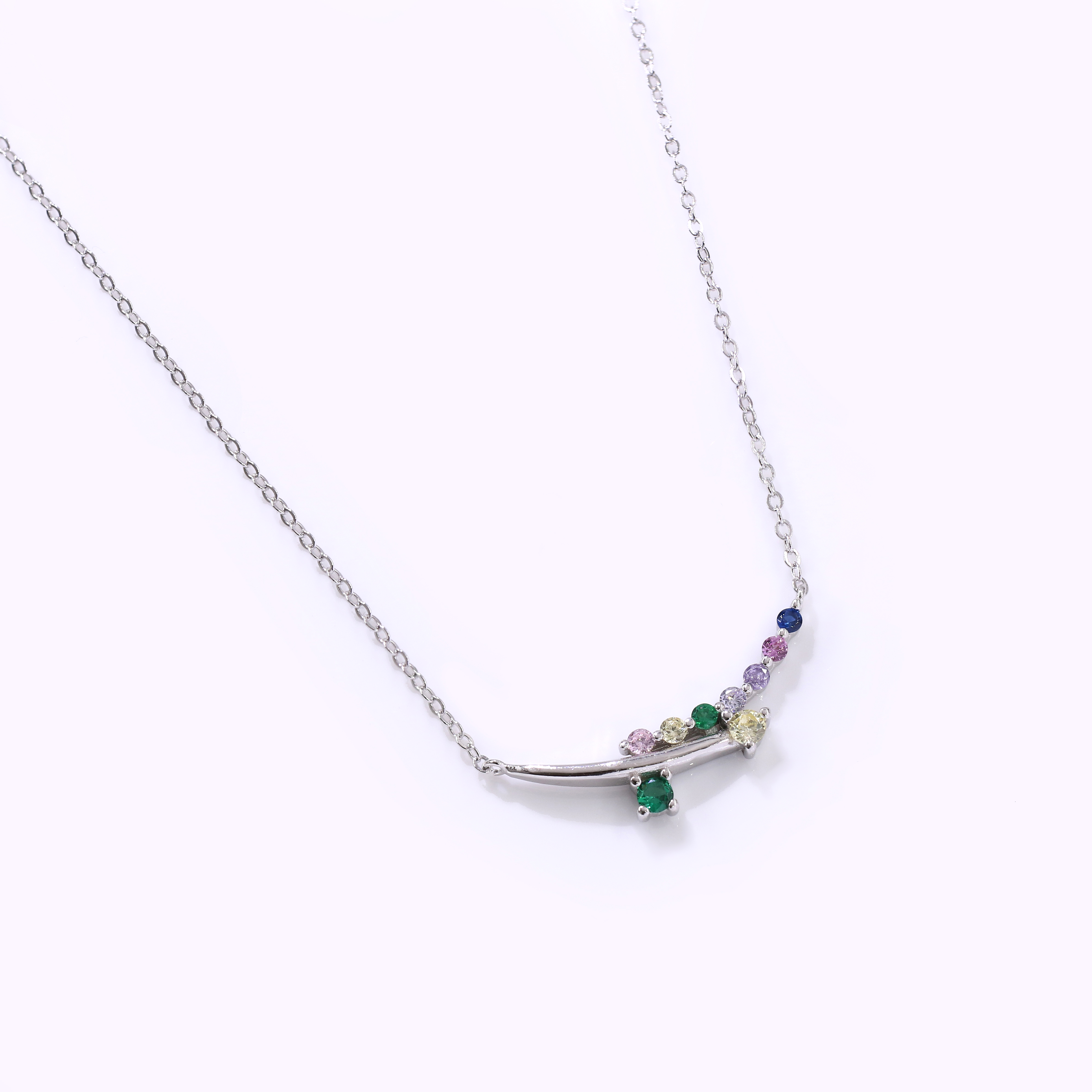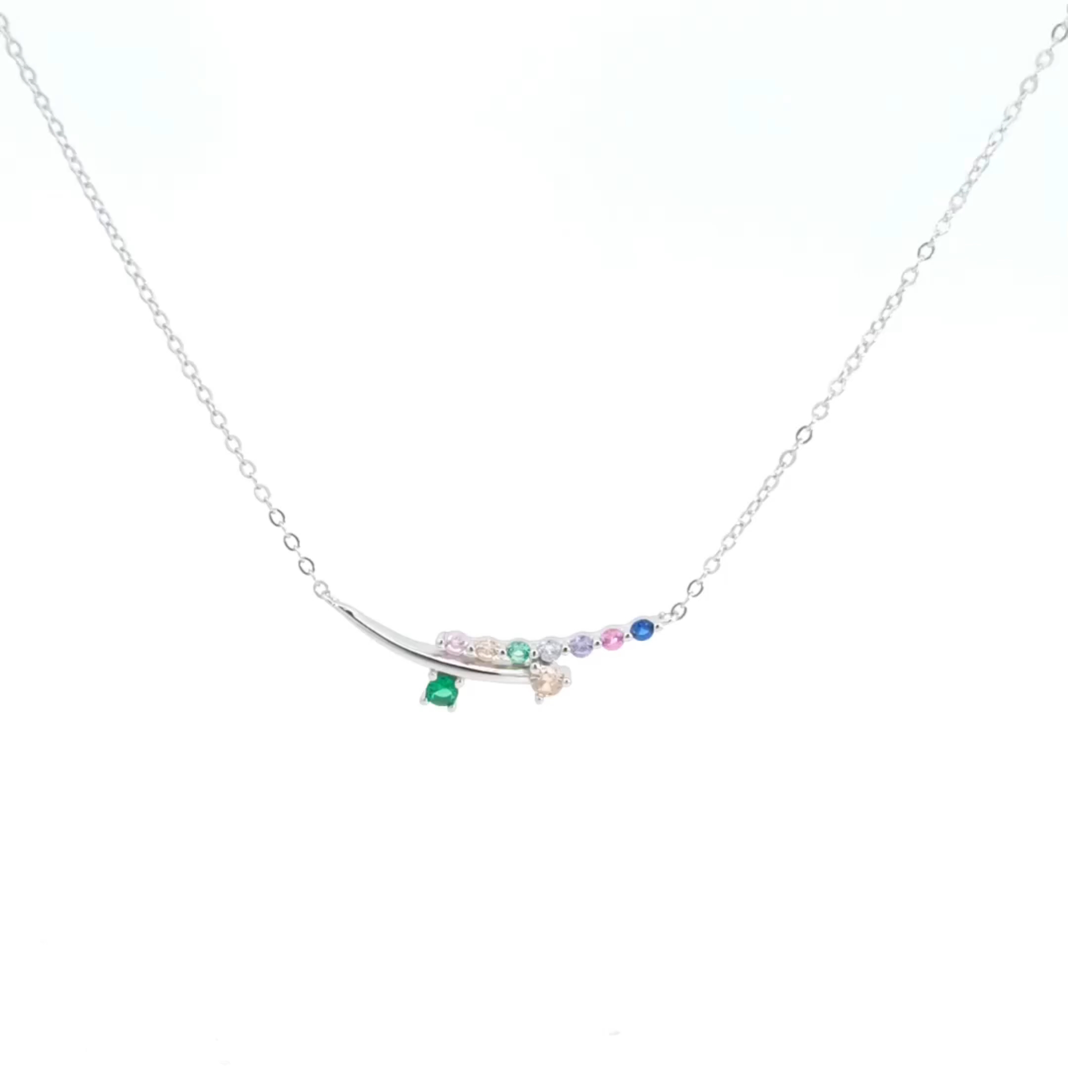 The pendant showcases a gently curved bar design, adorned with a spectrum of colorful, round-cut stones, creating a playful and eye-catching effect. A single, larger green stone is set beneath the curve adding balance and visual interest. The stones are carefully set in a polished silver-colored metal framework, enhancing their vibrancy.