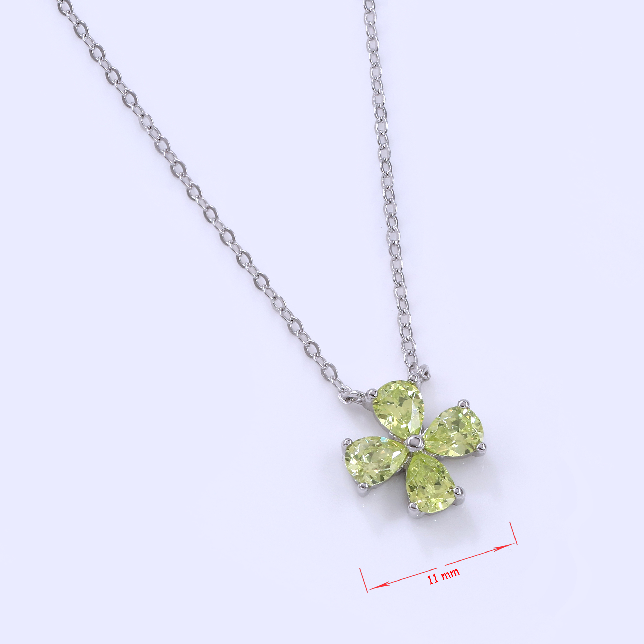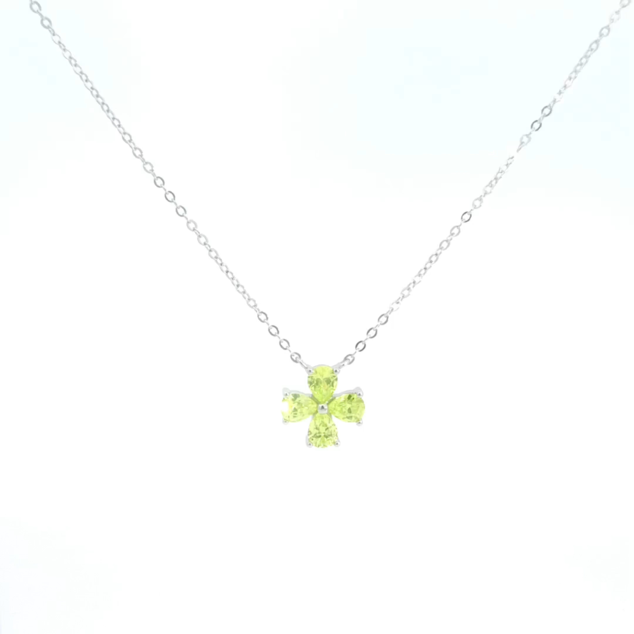 The pendant showcases a clover or four-petal flower design, formed by four light green, pear-shaped stones that are carefully set in a polished silver-colored framework. The design is both elegant and playful, making it a versatile accessory for any occasion.