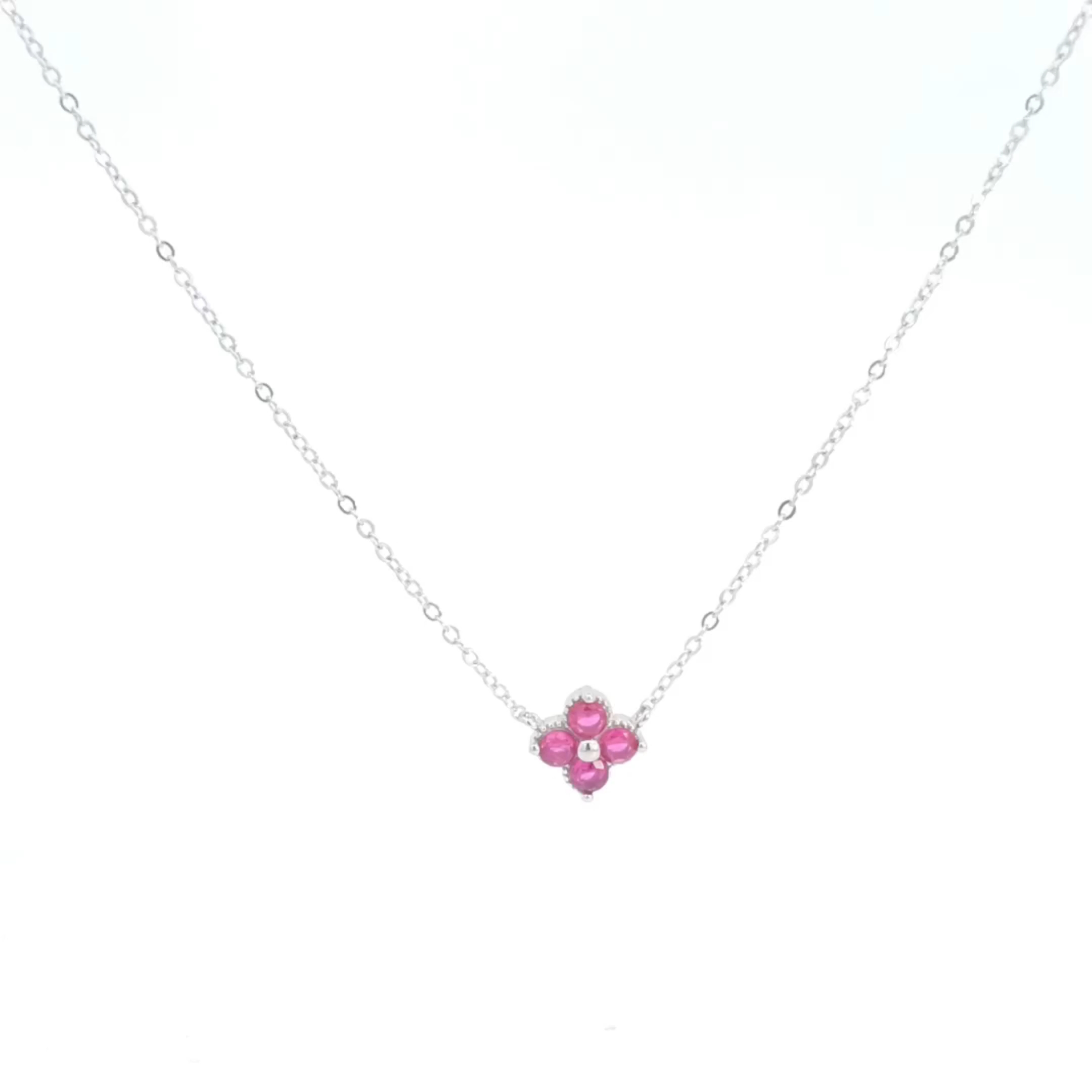 The pendant showcases a clover or four-petal flower design, formed by four pink, round-cut stones. The stones are carefully set around a central point in a polished silver-colored framework. This necklace combines a classic design with a touch of vibrant color, making it a perfect accessory for any occasion.