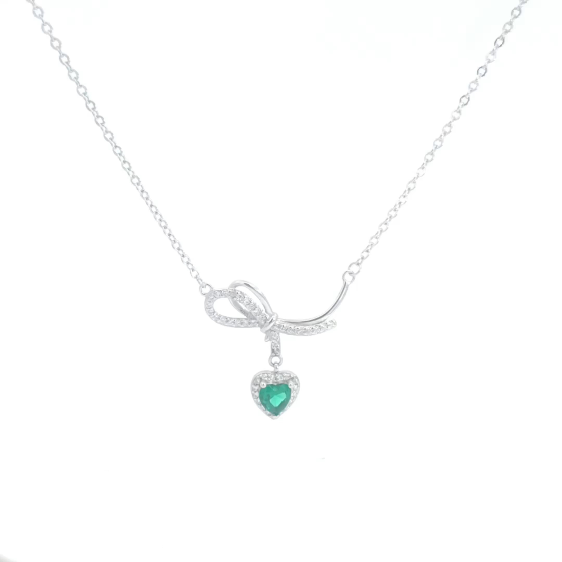 The necklace showcases a stylized bow, intricately set with clear, sparkling stones. A heart-shaped pendant, featuring a vibrant green heart-shaped stone surrounded by a halo of small, clear stones, dangles gracefully from the center of the bow. The combination of the bow and heart design creates a charming and sophisticated accessory.