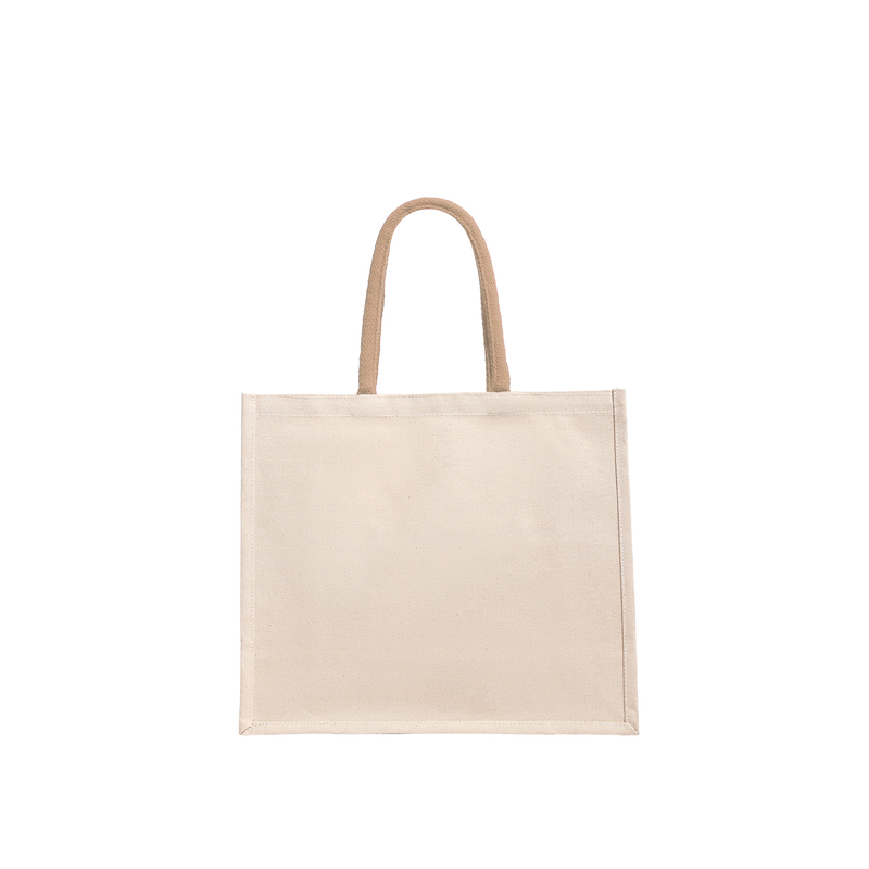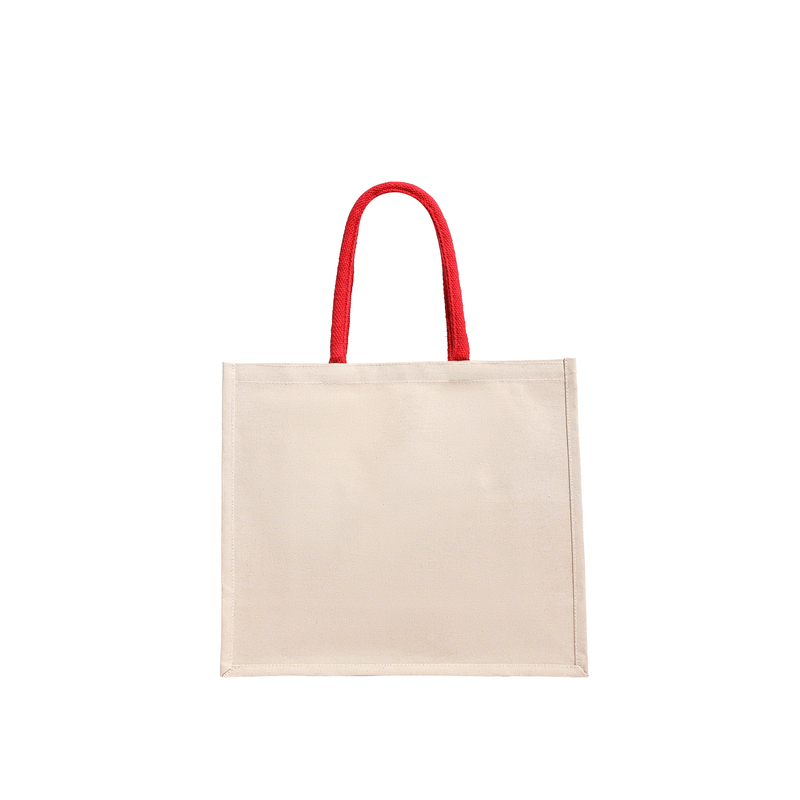 Natural NATURAL LAMINATED CANVAS BAG WITH RED HANDLE -40X35X16CM. / Handle: 47 CM RED COLOR COTTON WEB PADDED HANDLE. Print: Max Printing Area: 25.4X18 CM - Materials 300GSM LAMINATED NATURAL CANVAS WITH DYED HANDLE.