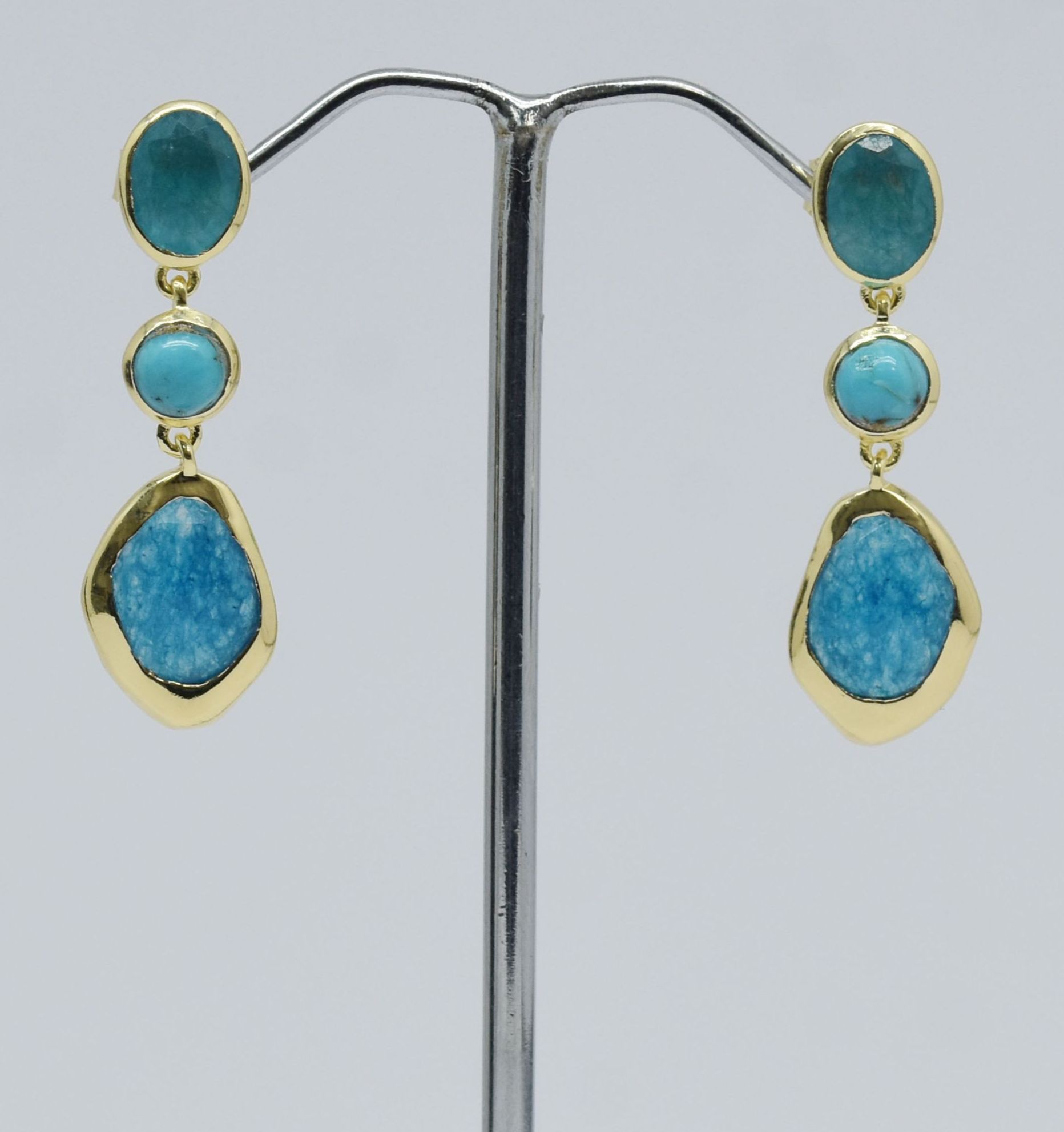A long stone-studded earring featuring a combination of Green white jade, Copper turquoise, and Blue-black jade.