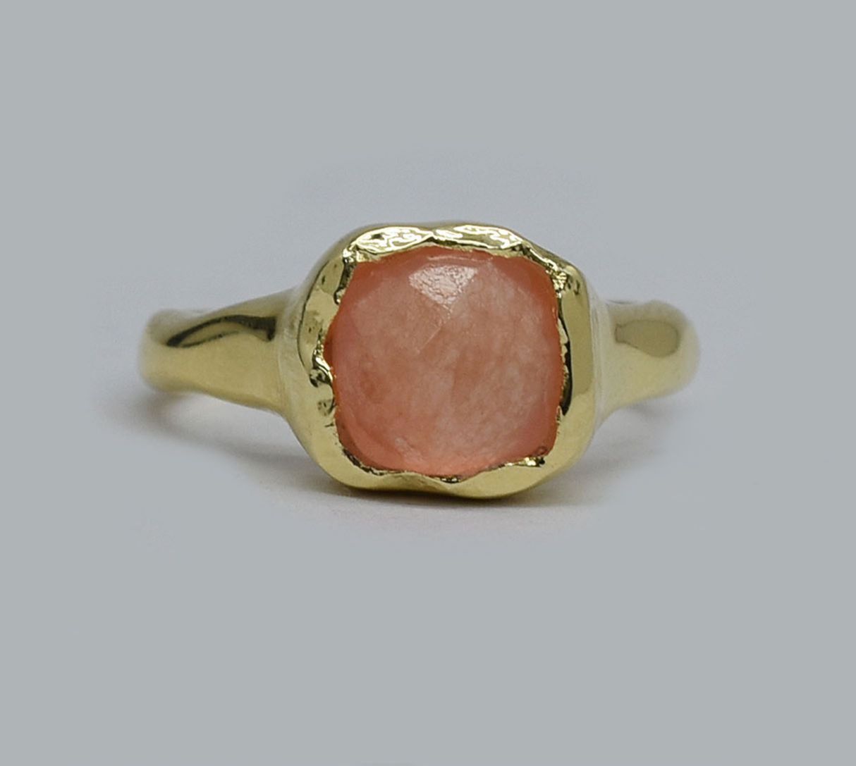 This orange jade semi-precious brass ring is a vibrant fusion of warmth and elegance.