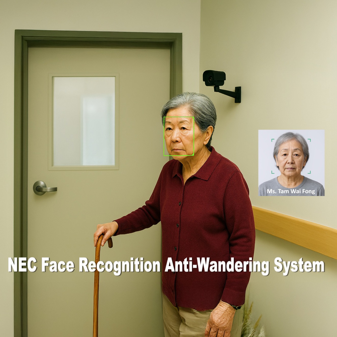 <NEC Face Recognition Anti-Wandering System> is designed for monitoring exits and preventing the elderly from wandering off a facility unguarded.