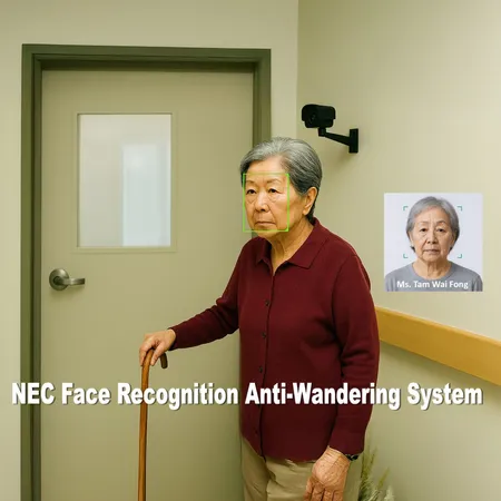 The Anti-Wandering System installed NEC Face Recognition Technology on CCTV network for identifying and locating the elderly. When the system detects the elderly near a CCTV-monitored exit, the system will capture the facial image of the elderly for matching and identification, then an alert will be sent to the Nurse Station to inform staff and caregivers. The system can monitor all exits, with no blind spots to support elderly care services.