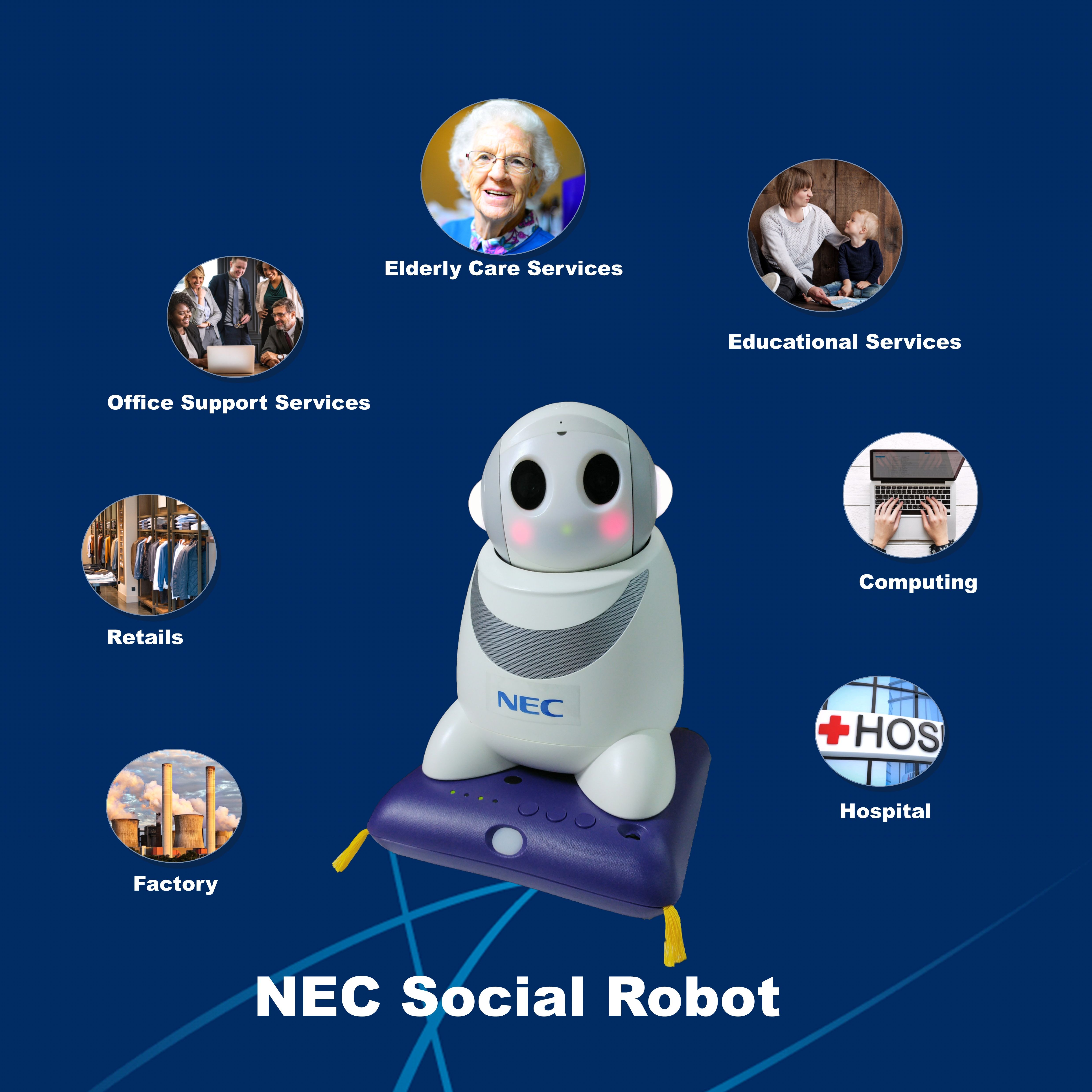NEC 社交機械人能提供多國語言的互動對話 (包括粵語、普通話、 英語等),大腦訓練及自理能力訓練,從而增強兒童和老人的溝通和社交能力,更為老人提供生活陪伴和心靈支援。