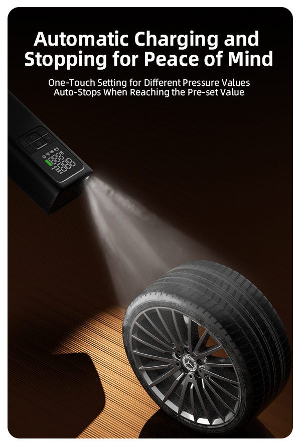 Smart One-Touch Operation: Features five preset inflation modes (Ball, Bike, Motorcycle, Car, and a Custom mode from 2-150 PSI). Simply select the mode, and the built-in high-precision sensor ensures the pump automatically stops at the ideal pressure, offering a safe and foolproof experience.