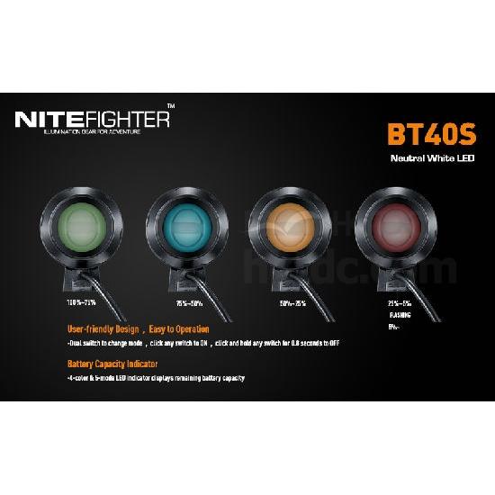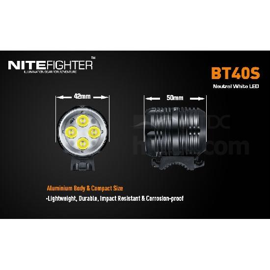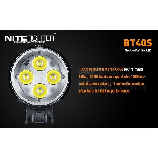 BT40S is a wide beam and high brightness mountain bike front light. Utilizing four Cree XP-G2 Neutral White LEDs, four brightness modes, max output 1600-lumen. It including 7.4V 5200mAh BAK rechargeable li-on battery,more than 3hrs on high output. BT40 is the ideal illumination gear for mountain biking, touring, commuting, etc.