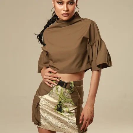 Bottom piece: a skort-style design featuring a skirt appearance at the front and shorts at the back, made from a combination of ripstop and jacquard fabrics to stay trendy, complete with flap cargo-style pockets for added functionality and edge.