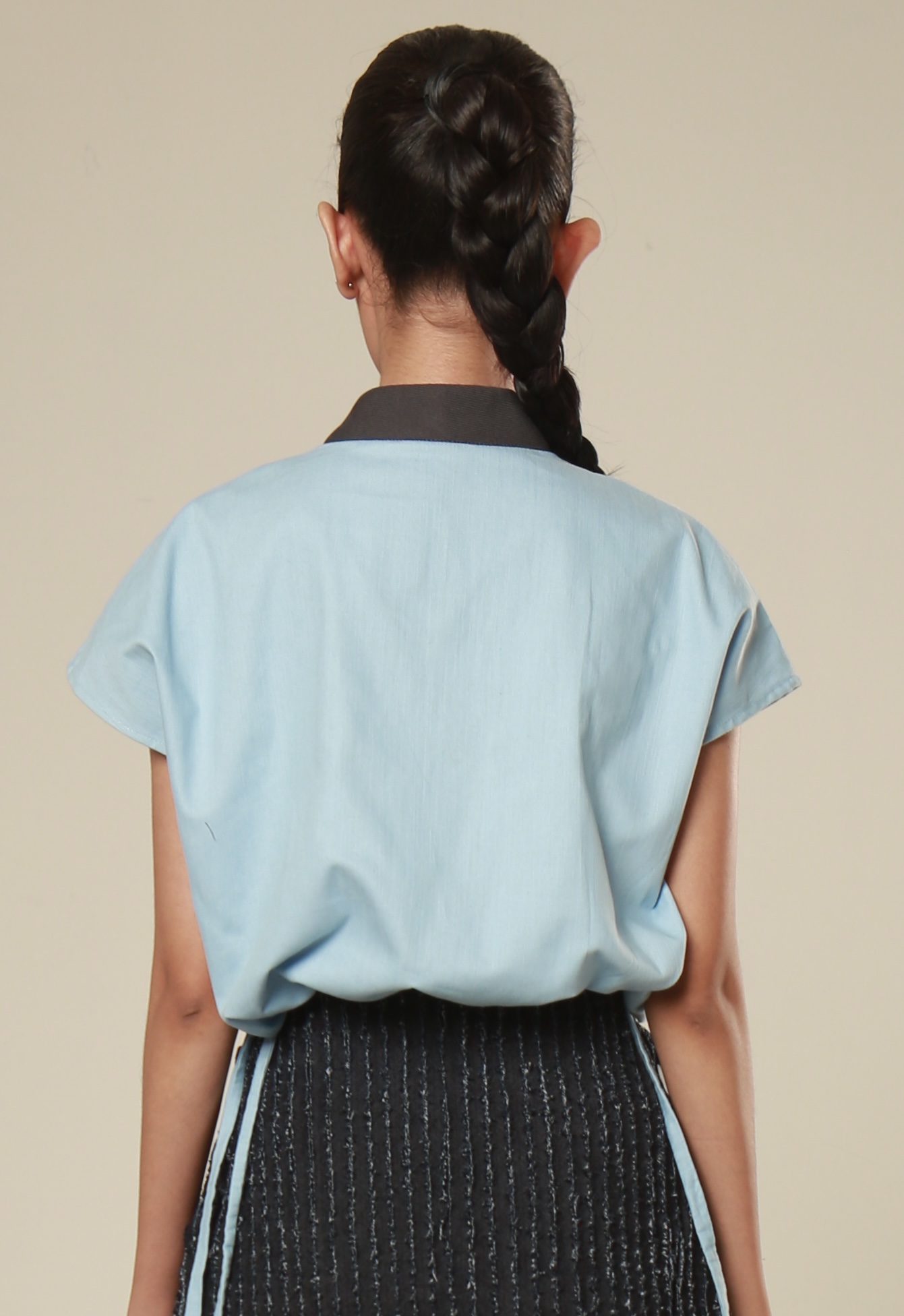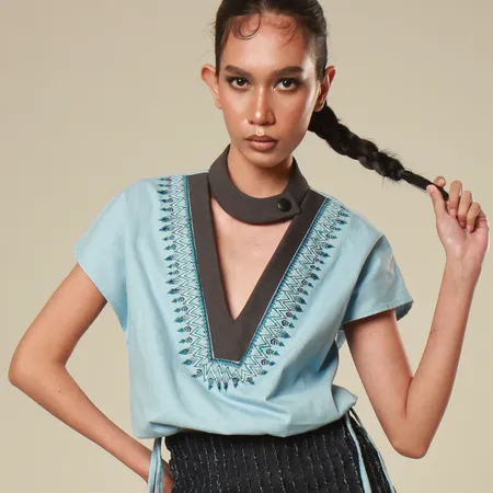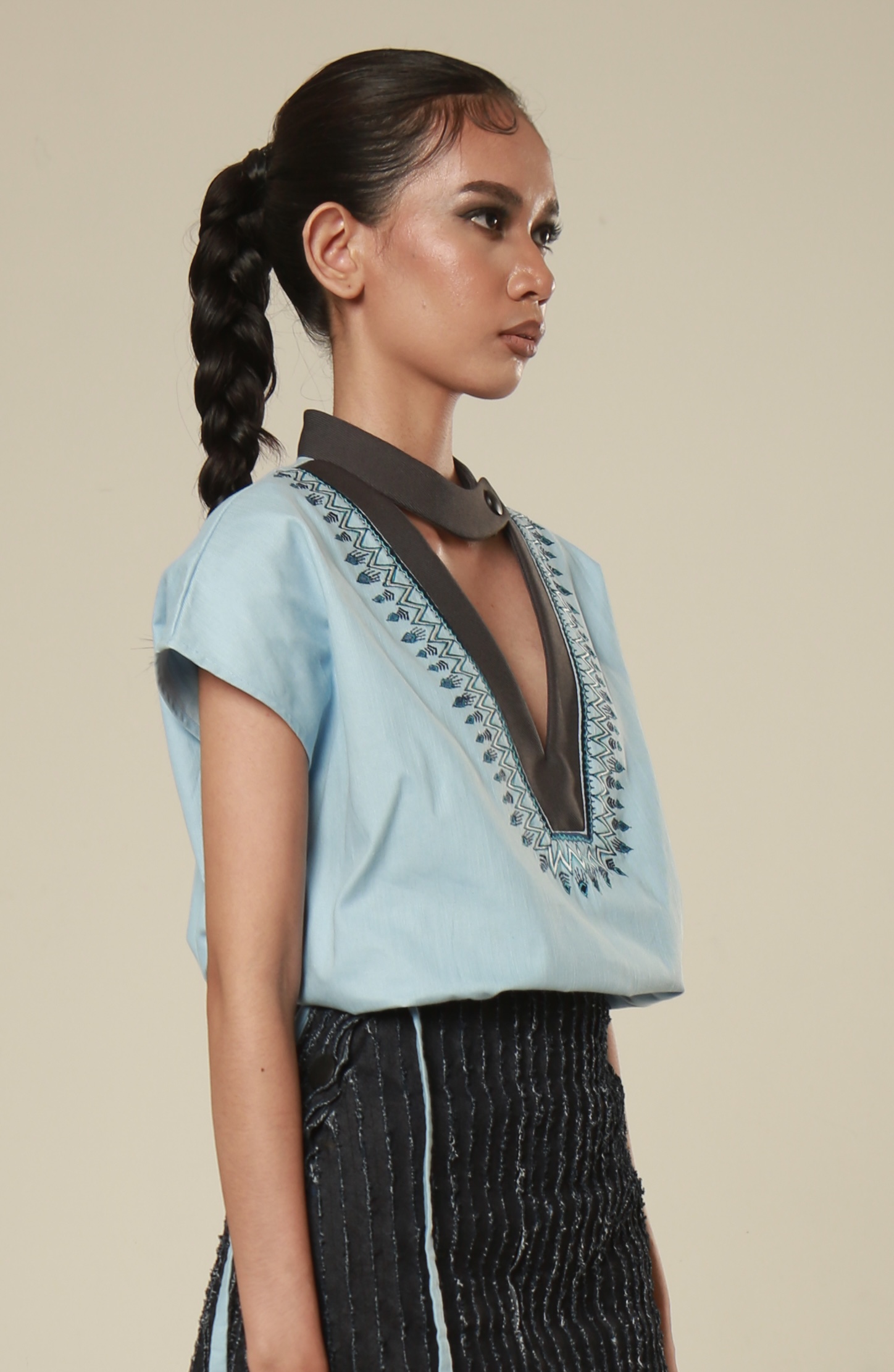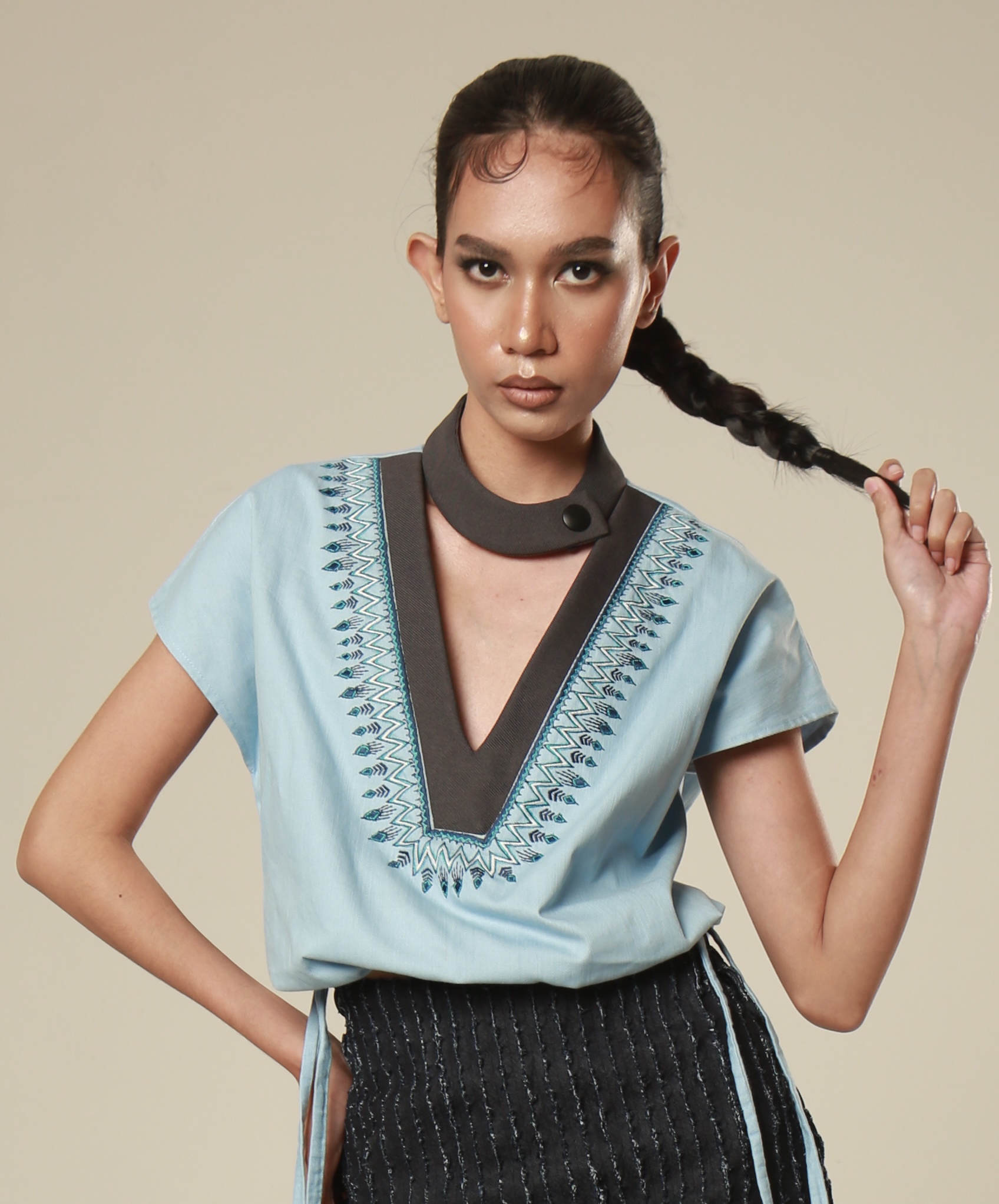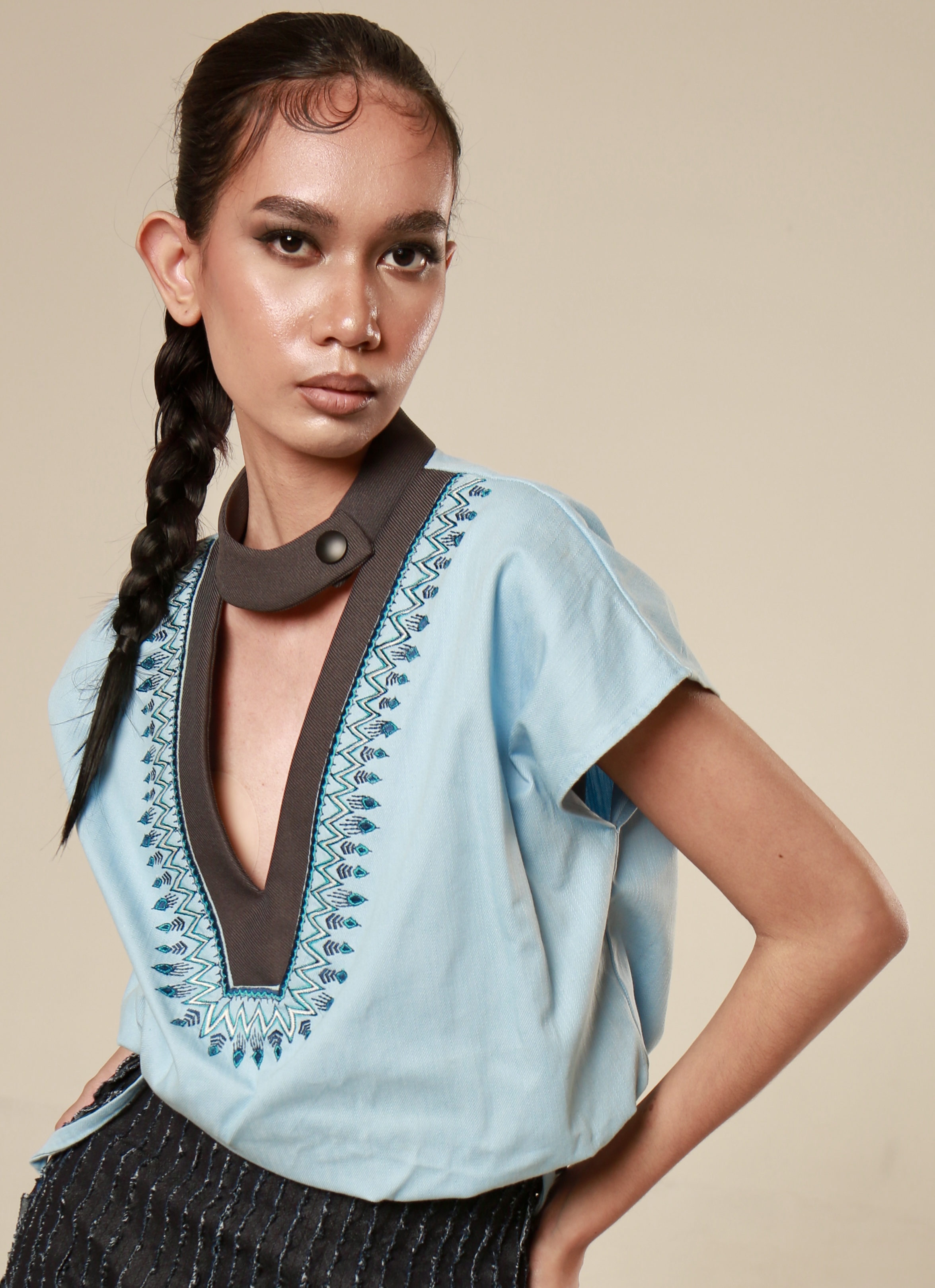 NASYWA ZAHRADINA TUNGGAL DEWINZ 03White Blue Denim With Embroidery Detail And V-Neck With a Bold Outline, All Size, 300gr, Women