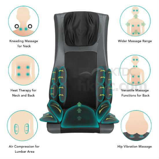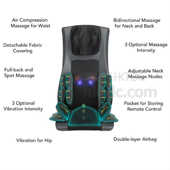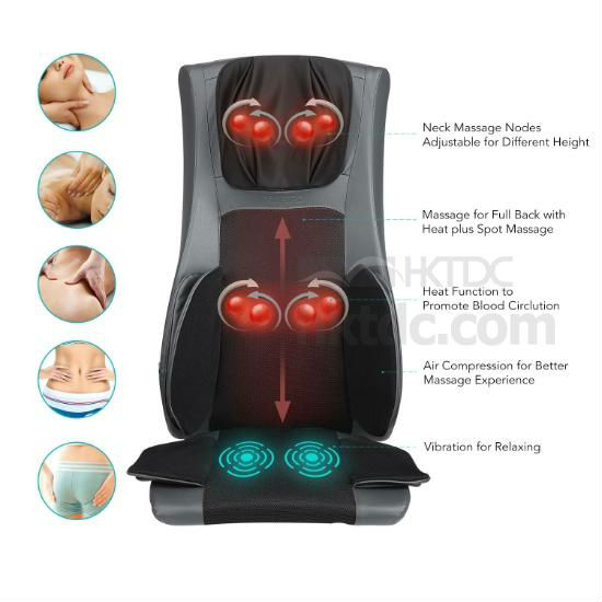 - Kneading, Shiatsu, Spot Massage, Air pressure, heat, Vibration.