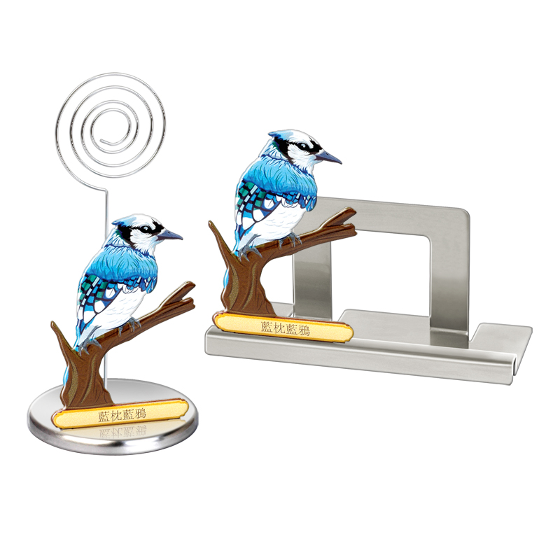 This metal card holder set offers a rectangle-based name card stand and a round-based memo holder. The set accents a color-printed Azure-naped jay figurine, enlivening a boring office table with a bit of colors. Built with a swirl holder at the tip, this silvery stand lifts up cards for the sake of easy view.