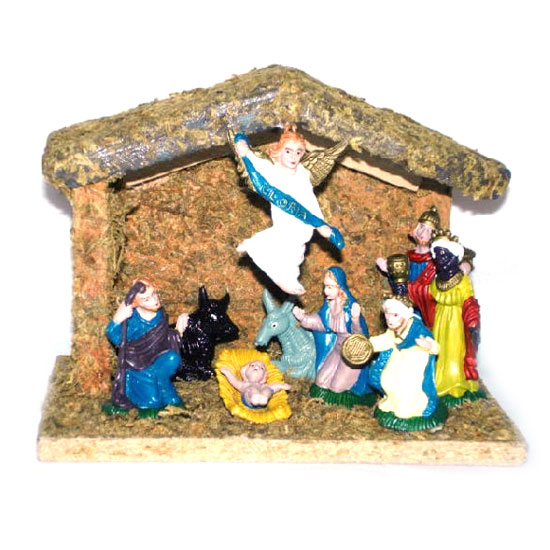 Displayed is a nativity set coming with a stable and several plastic hand-painted religious figurines. The figurines includes baby Jesus, Mary, Joseph and an angel. It is an ideal decoration for an indoor centerpiece and Christmas decoration.