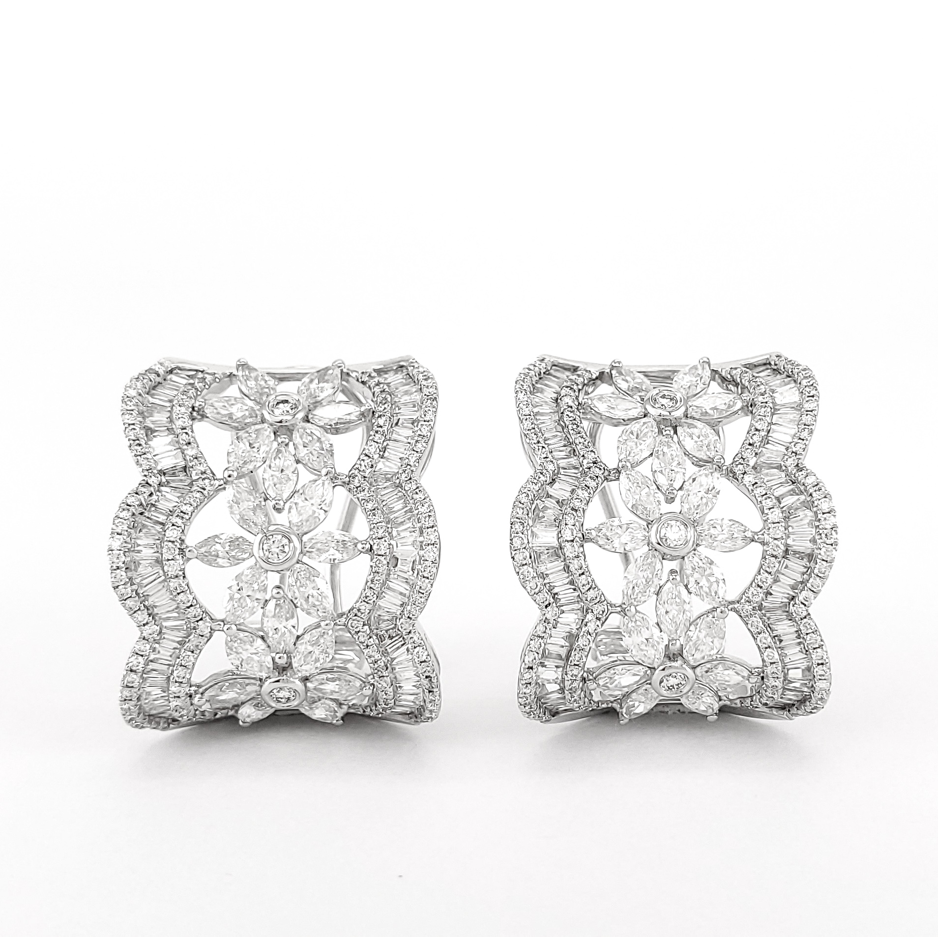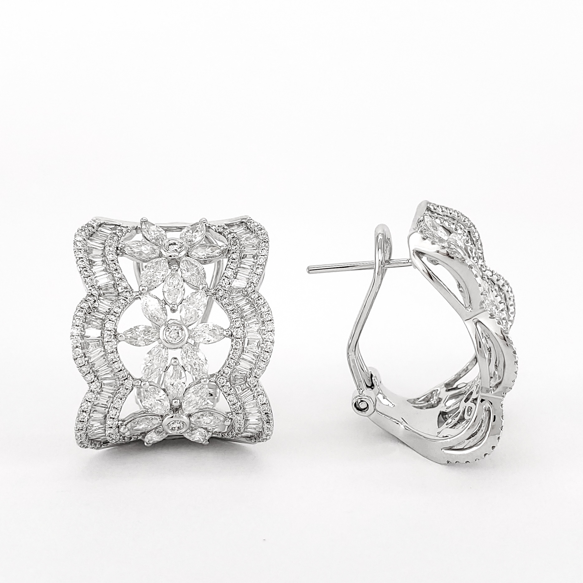Brilliant round, baguette and marquise natural diamonds set in 18k white gold huggie earrings featuring a dazzling floral design. This style also has a matching ring.