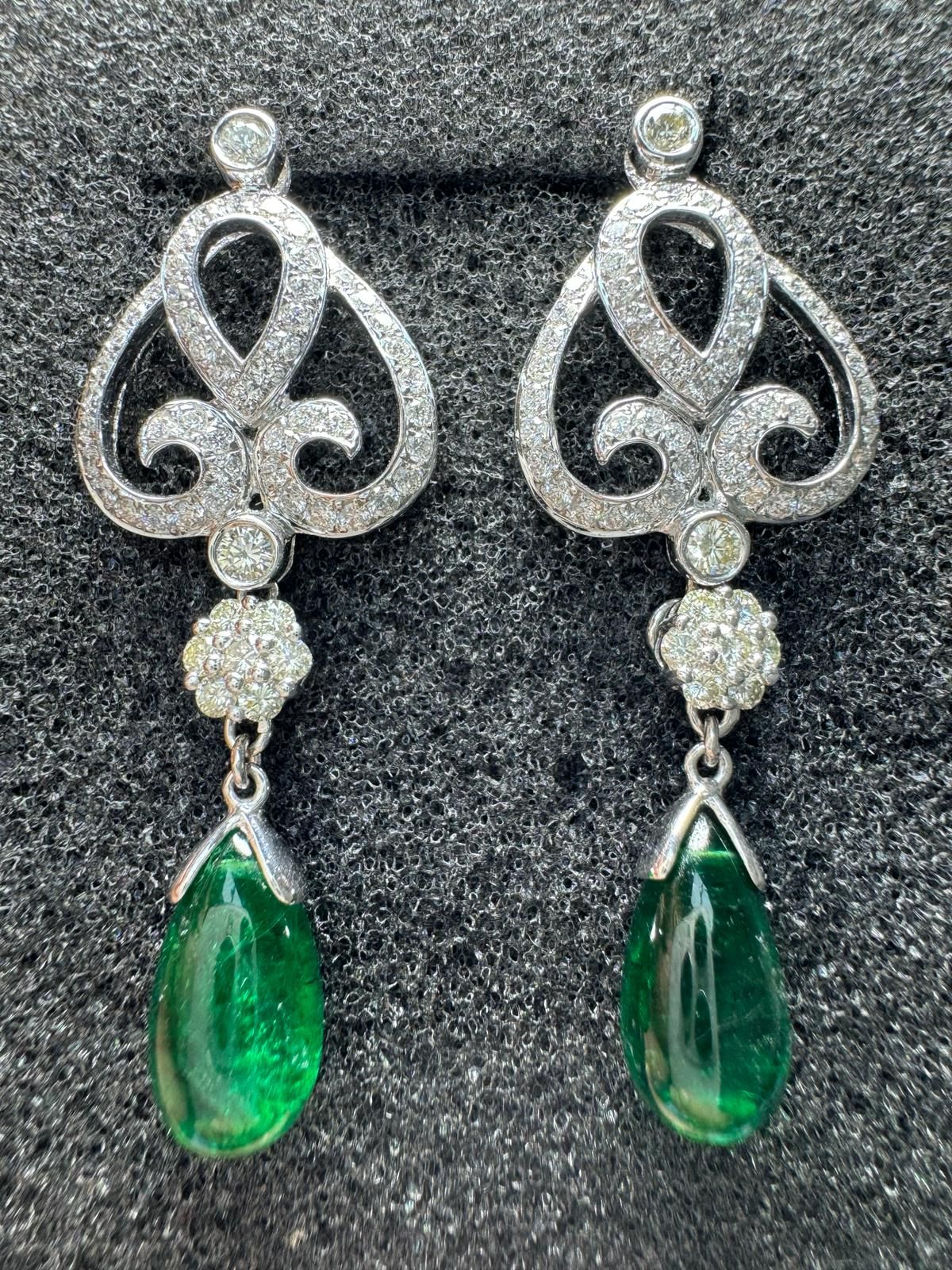 18K Emerald Drop Diamond Earrings - 2 piece Emerald Drop 8.42cts & 114 pieces Diamond 1.40cts(White Diamond: 98 pieces 0.91cts & Yellow Diamond: 16 piecds 0.49cts)