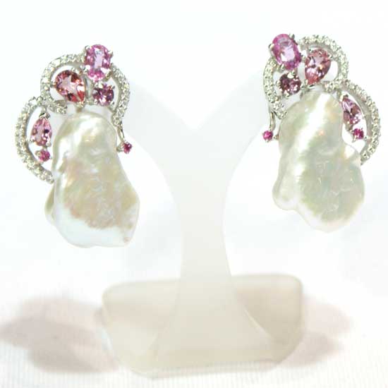 This pair of natural pearl earrings is adorned with petite pink sapphire stones. The baroque pearl decoration is well processed to give lasting attractiveness. This pair of pearl earrings is suitable to add classy accents to mature ladies' dresses.