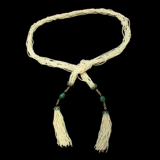 Presented is a necklace finely constructed with natural pearls and gorgeous emerald accents. This antique piece was made in 1850 in Russia, carrying the history and beauty over the centuries. This exquisite, valuable and enviable piece is the ideal piece to enhance your natural glow with unspoken romance.