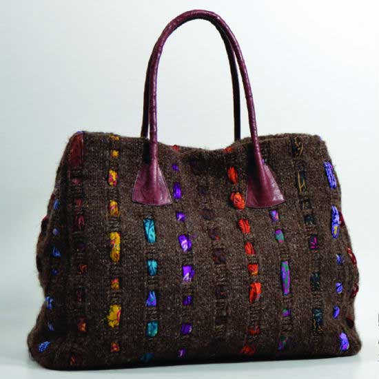 Pictured is a made-in-Italy handbag endearingly named Alpagota. Alpagota is made with natural wool with raw linen lining and pure silk inserts. The colorful inserts make lovely contrasts with the chocolate brown handbag.